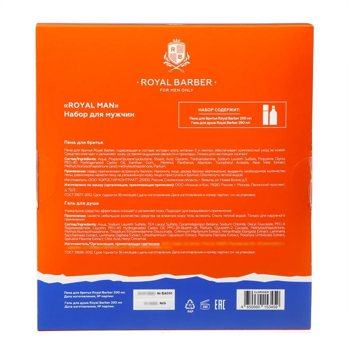 Набор для настоящих мужчин, которые всегда держат свое слово! Набор Royal Man от Royal Barber состоит из пены для бритья (200 мл), которая содержит в составе экстракт алоэ, витамин E и ментол и обеспечивает комплексный уход за кожей, и геля для душа (290 мл), который эффективно очищает и увлажняет кожу и подходит для ежедневного применения.