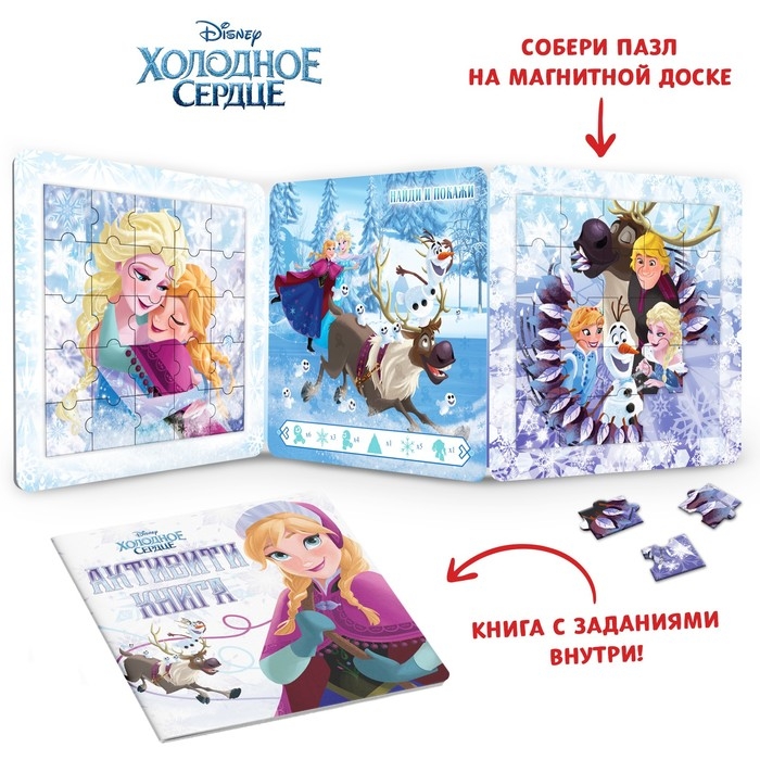Ощутите зимнее волшебство вместе с героями «Холодного сердца»! Соберите 2 чудесных магнитных пазла, сыграйте в настольную игру всей семьёй и выполните все задания!