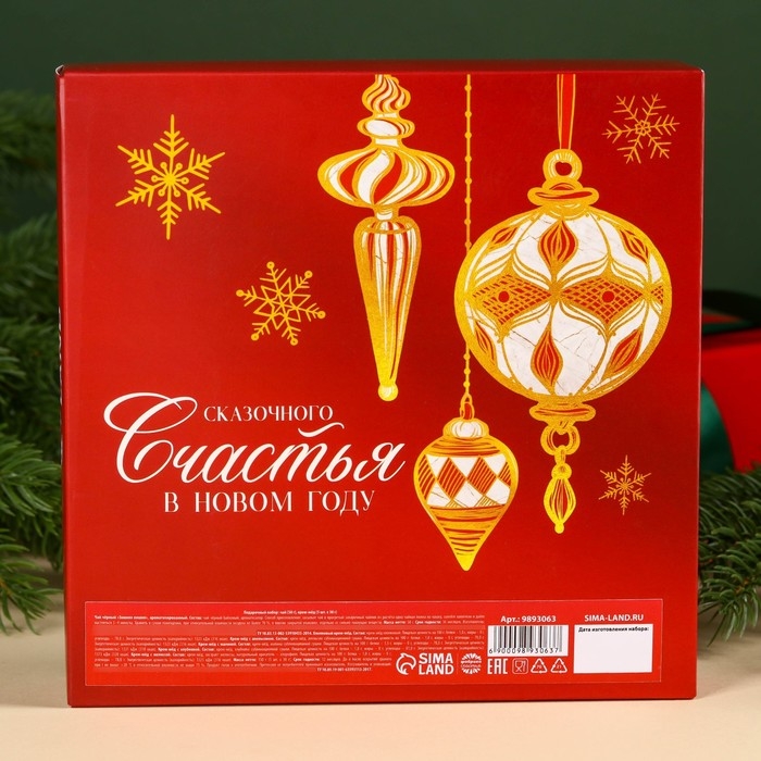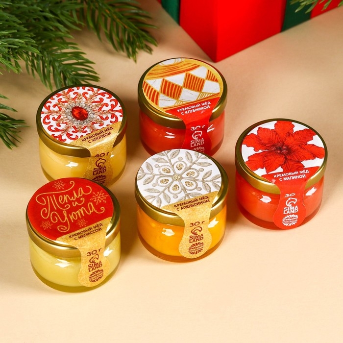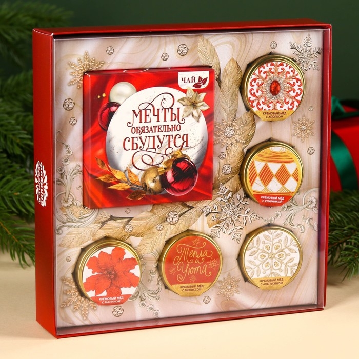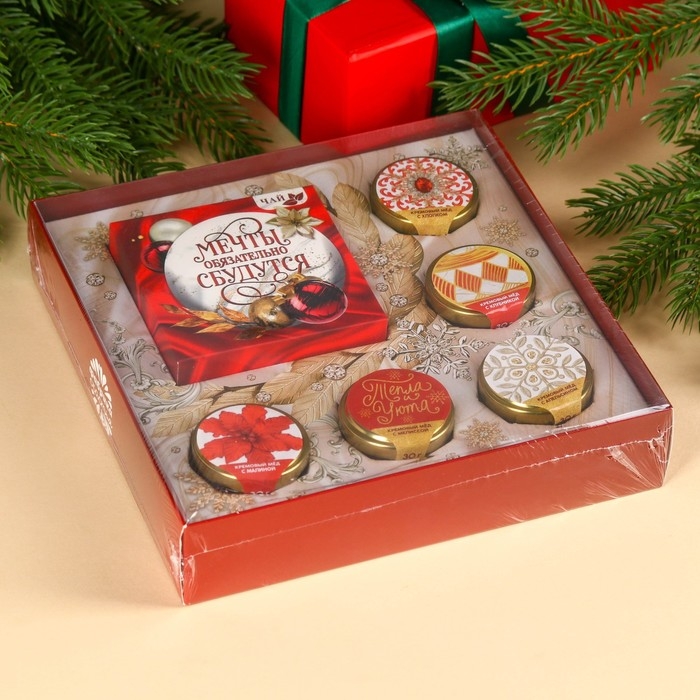 Подарочный набор «Мечты сбудутся»: чай чёрный со вкусом: зимняя вишня 50 г., крем-мёд: с малиной, с апельсином, с клубникой, с мелиссой, 150 г (5 шт. x 30 г).