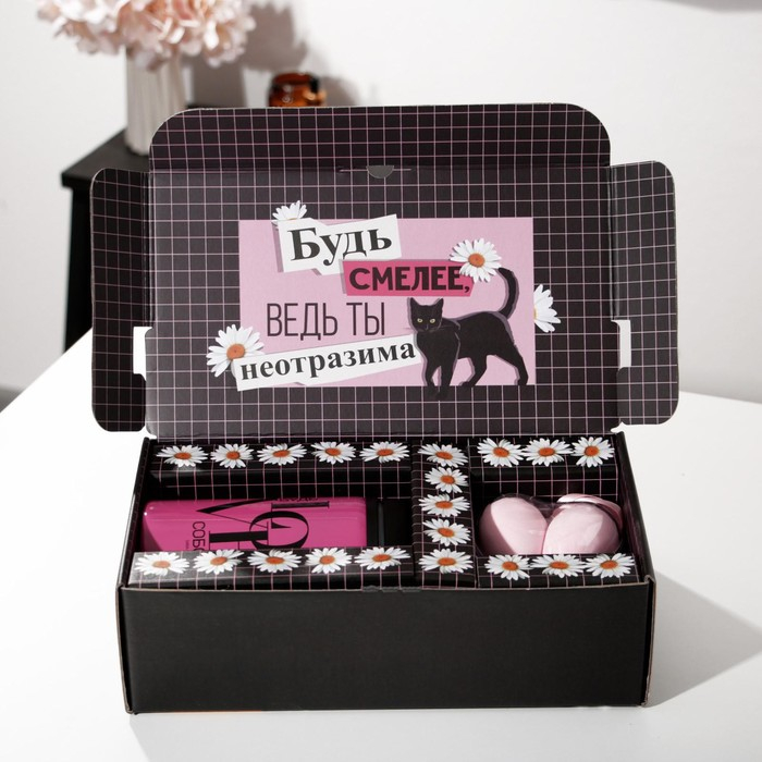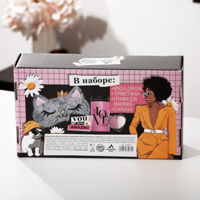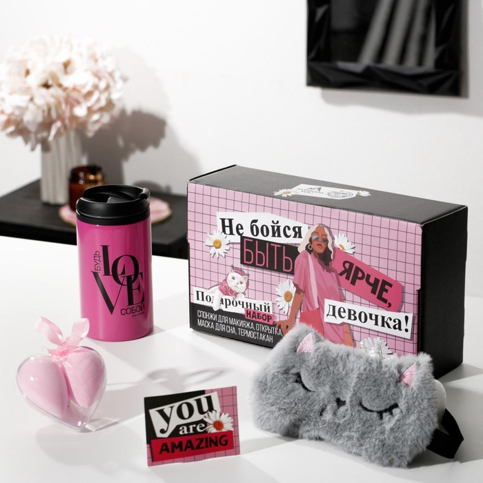 Подарочный набор «Не бойся быть ярче», маска для сна, термостакан, спонж 2 шт, открытка