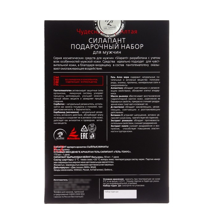 Подарочный набор Silapant включает в себя бальзам после бритья и гель-тонус. Объемы продуктов составляют 50 мл и 170 мл соответственно. Бальзам после бритья предназначен для ухода за кожей после бритья, он увлажняет и успокаивает кожу, предотвращая раздражение. Гель-тонус подходит для ежедневного ухода за кожей лица и шеи, он помогает поддерживать тонус и упругость кожи, улучшает микроциркуляцию и способствует уменьшению морщин. Оба продукта имеют натуральный состав и подходят для всех типов кожи.