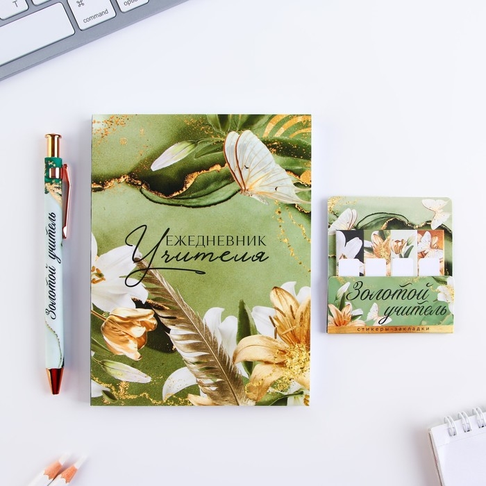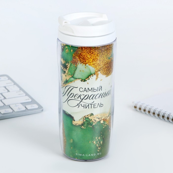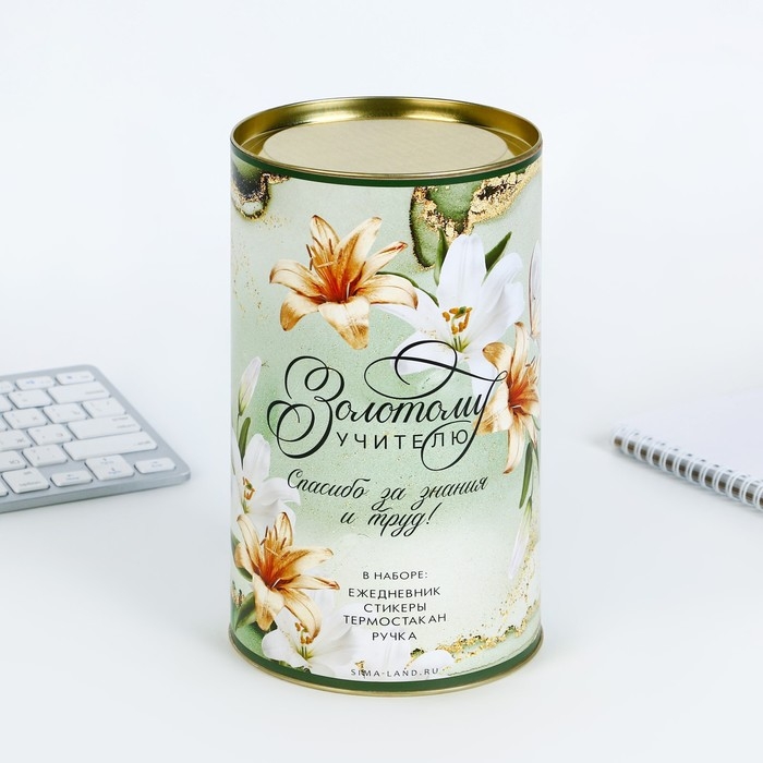 Подарочный набор в тубусе «Золотому учителю»: ежедневник, А6, 120 листов, стикеры с липким краем, термостакан 350 мл, ручка