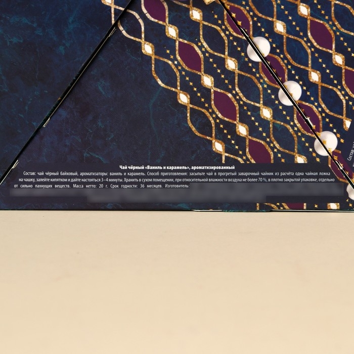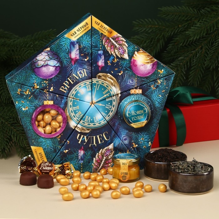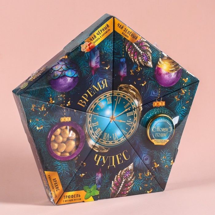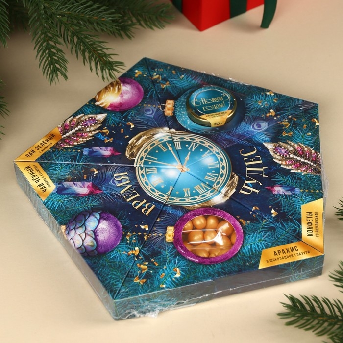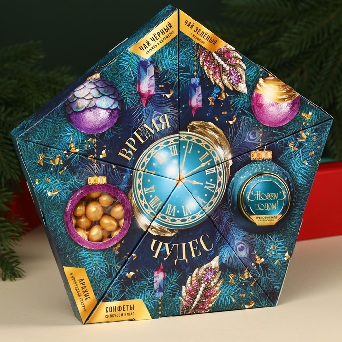 Подарочный набор «Время чудес»: чай чёрный со вкусом: ваниль и карамель 20 г., чай зелёный с жасмином 20 г., арахис шоколаде70 г., шоколадные конфеты 100 г., крем-мёд с апельсином 30 г.