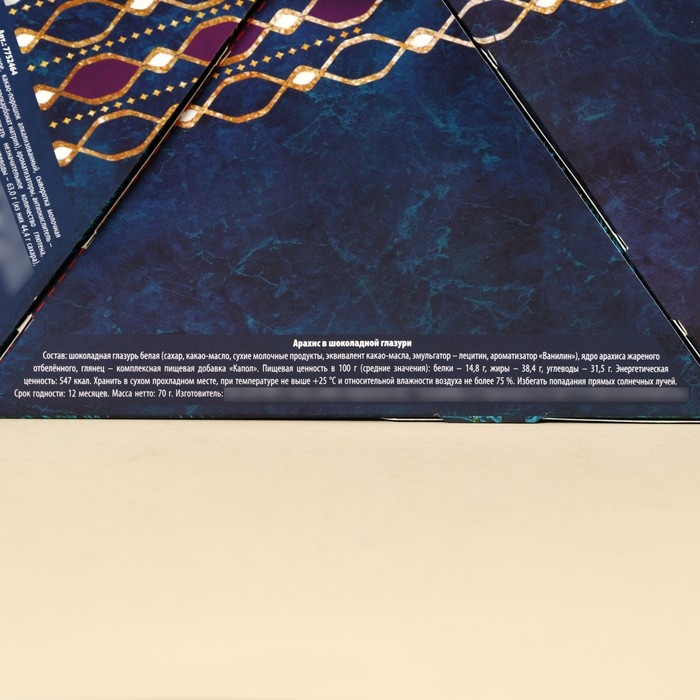 Состав: шоколадная глазурь белая (сахар, какао-масло, какао-порошок, эквивалент какао-масла, эмульгатор – лецитин, ароматизатор «Ванилин»), ядро арахиса жареного отбелённого, глянец – комплексная пищевая добавка «Капол».