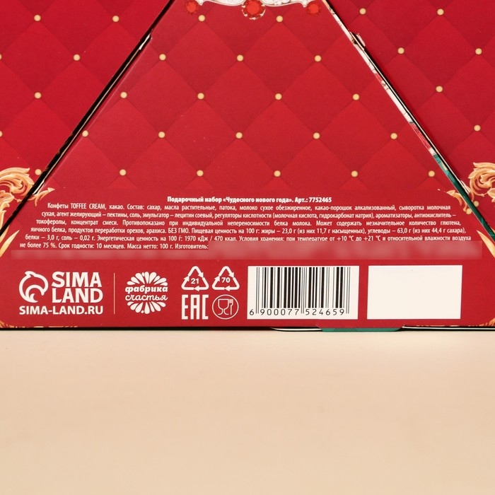 Состав: сахар, заменитель масла какао нетемперируемый лауринового типа (масло пальмоядровое, масло пальмоядровое рафинированное дезодорированное гидрогенизированное, эмульгаторы (Е492, Е322)), сыворотка молочная сухая, какао-порошок, ПЭК «Рис воздушный» (крупа рисовая, мука пшеничная, сахар, соль), патока, носитель – карбонат кальция (Е170), кукурузный крахмал, соль, эмульгаторы (лецитин соевый Е322, E476), ароматизаторы: «Коньяк», «Ванилин». Может содержать следы арахиса, орехов.