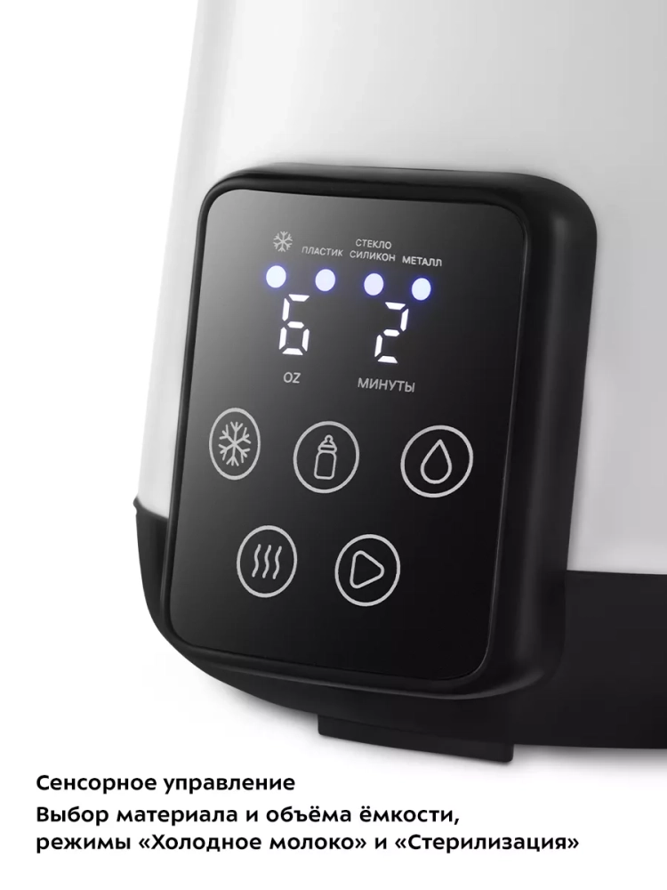 Прибор имеет простое управление сенсорными кнопками и дисплей. После выбора количества разогреваемого детского питания и выбора материала бутылочки устройство автоматически выставит время разогрева. На дисплее показан таймер обратного отсчета при разогреве и прямого отсчета во время стерилизации. В комплекте к прибору идет мерный стакан для удобного наливания воды в чашу.