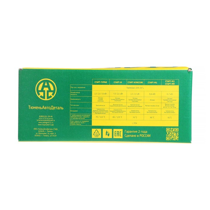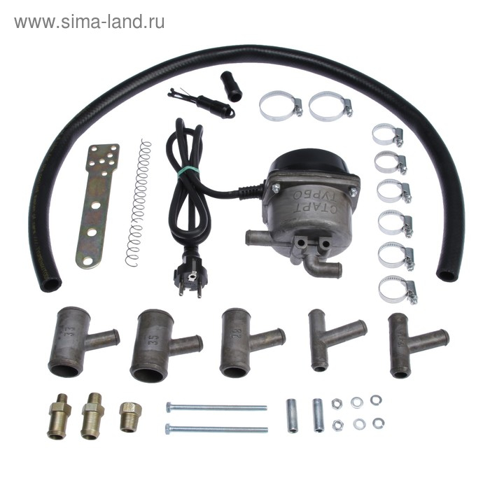 "Старт-Турбо" предназначен для предпускового разогрева и подогрева двигателей легковых, среднетоннажных и грузовых автомобилей отечественного и зарубежного производства в зимний период эксплуатации. При подключении подогревателя к сети переменного тока напряжением 220В электроподогреватель – ТЭН, находящийся внутри корпуса, начинает нагревать охлаждающую жидкость. Одновременно включается центробежный электронасос. Центробежный электронасос обеспечивает непрерывную циркуляцию охлаждающей жидкости через подогреватель и рубашку системы охлаждения двигателя, к которой подключен подогреватель. Этим достигается быстрый и равномерный прогрев двигателя, а также исключается перегрев ТЭНа и увеличивается срок его службы. Терморегулятор автоматически поддерживает температуру охлаждающей жидкости в заданных пределах и предотвращает её перегрев при длительной работе подогревателя. Время разогрева двигателя зависит от климатических условий (температура, ветер), а также от условий стоянки автомобиля (открытая стоянка, гараж). Комплект Монтажный Универсальный содержит необходимые комплектующие для установки в систему охлаждения ДВС последовательно с отопителем салона.