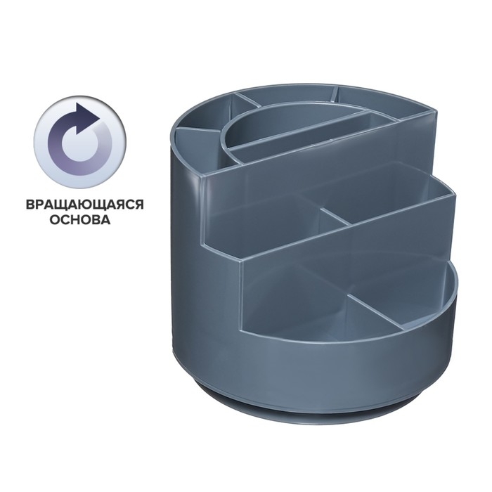 Подставка для удобного хранения настольных принадлежностей. Оснащена вращающимся механизмом и изготовлена из высококачественного пластика.