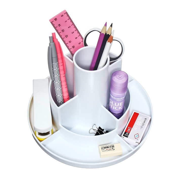 Подставка для удобного хранения настольных принадлежностей. Оснащена вращающимся механизмом и изготовлена из высококачественного пластика.