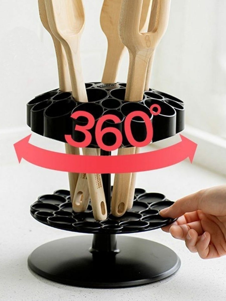 Подставка под кухонные принадлежности Utensil Caddy Круглая складная вращающаяся подставка (25 ячеек) идеально подходит для хранения столовых приборов. Конструкция особенно удобна во время приготовления пищи. Она легко вращается легким движением руки, что позволяет быстро найти нужную посуду. Подставка изготовлена из высококачественного абс пластика. Устойчивая конструкция. Легко вращается. Станет незаменимым помощником на вашей кухне. Современные кухни нельзя назвать просторными, а если хранение столовых приборов загромождено, то рабочее пространство может превратиться в беспорядок. Поэтому важно приобрести отдельные приспособления для хранения столовых приборов. К ним относятся настольные держатели для кухонных принадлежностей. Эта подставка изготовлена из прочного пластика и рассчитана на хранение 25 кухонных принадлежностей. Основание представляет собой узкий цилиндр с двумя кругами на вершине. В верхней части имеется сквозное отверстие для размещения столовых приборов, а в нижней - ячейки (соты), которые позволяют воде стекать, когда столовые приборы кладутся на них сразу после мытья. Прибор очень прост в использовании, его удобно размещать на столешнице, он не вызывает аллергии; для удаления загрязнений достаточно ополоснуть его обычной струей воды.