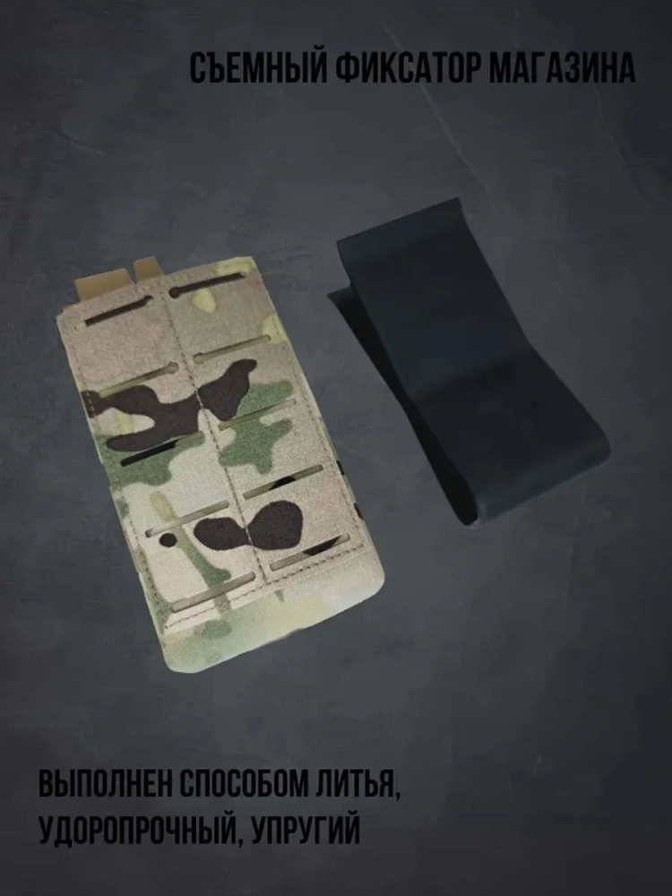 Подсумок оборудован интерфейсом MOLLE на фронтальной стороне, что позволяет устанавливать дополнительные подсумки и тактические аксессуары. Пластиковый подпружиненный фиксатор внутри надежно удерживает магазин, обеспечивая его быстрое извлечение. Благодаря своему универсальному дизайну, подсумок совместим с магазинами АК и М4.