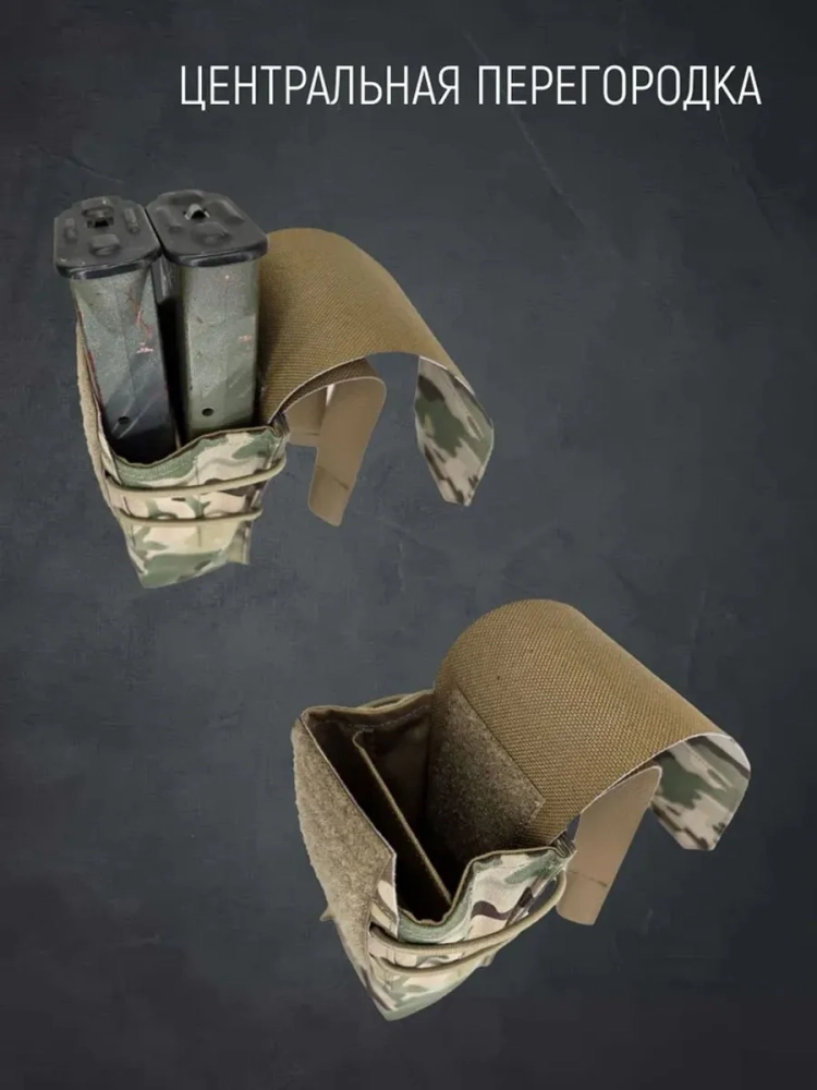 Наличие перегородки позволяет исключить демаскировку пользователя шумом при переносе в подсумке двух магазинов. Подсумок компактен, адаптирован под быстрое и удобное извлечение магазинов.
