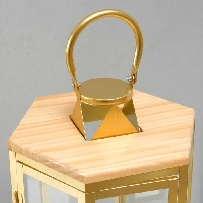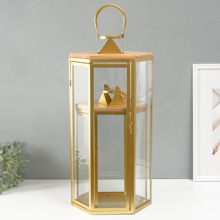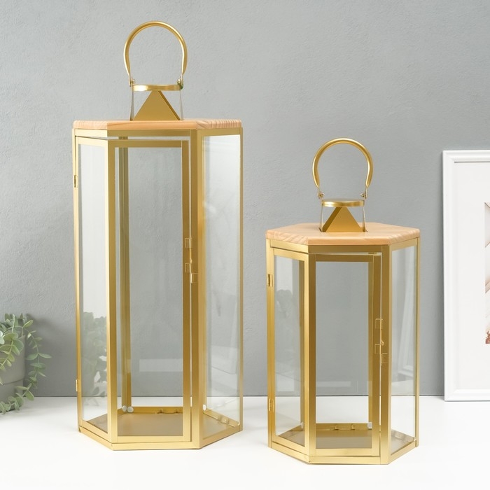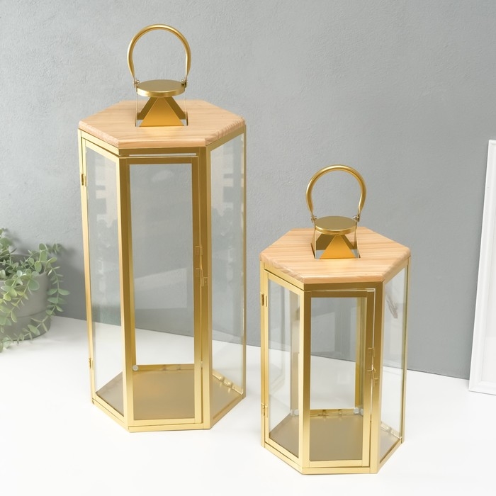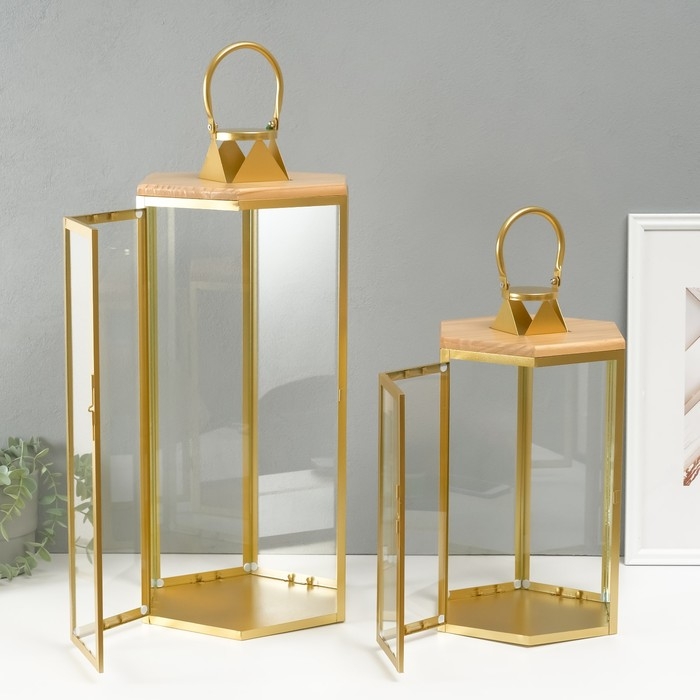 Подсвечник металл, дерево, фонарь"Шесть граней" набор 2 шт 22,5х19,5х38; 22,5х26х55 см
