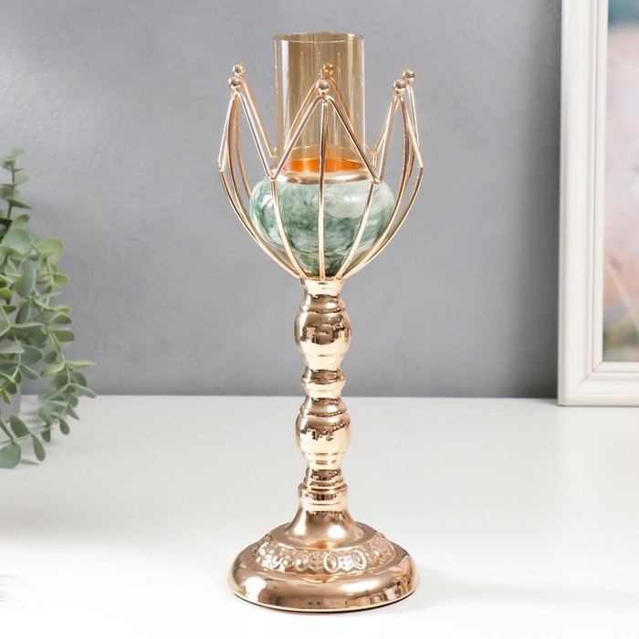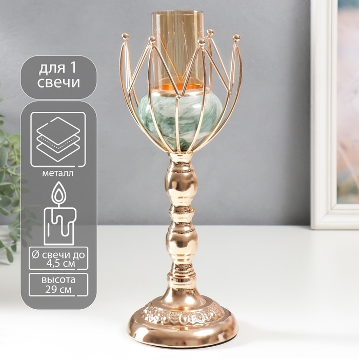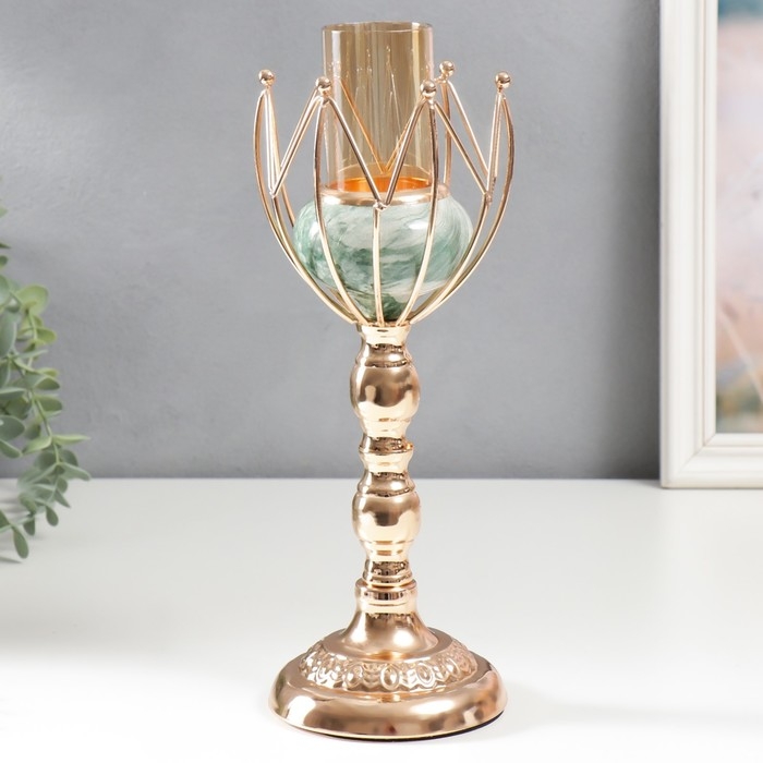 Подсвечник металл на 1 свечу "Бутон. Бело-зелёный мрамор" золото 29х11х11 см