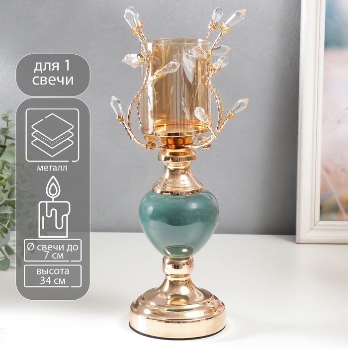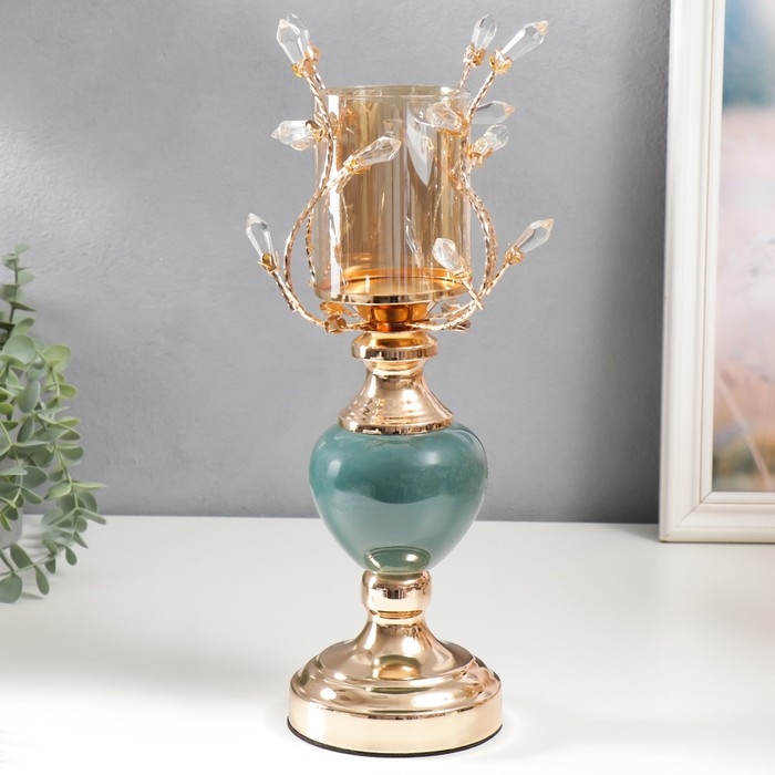 Подсвечник металл на 1 свечу "Веточки с кристаллами. Сине-зелёный шар" золото 34х17х17 см