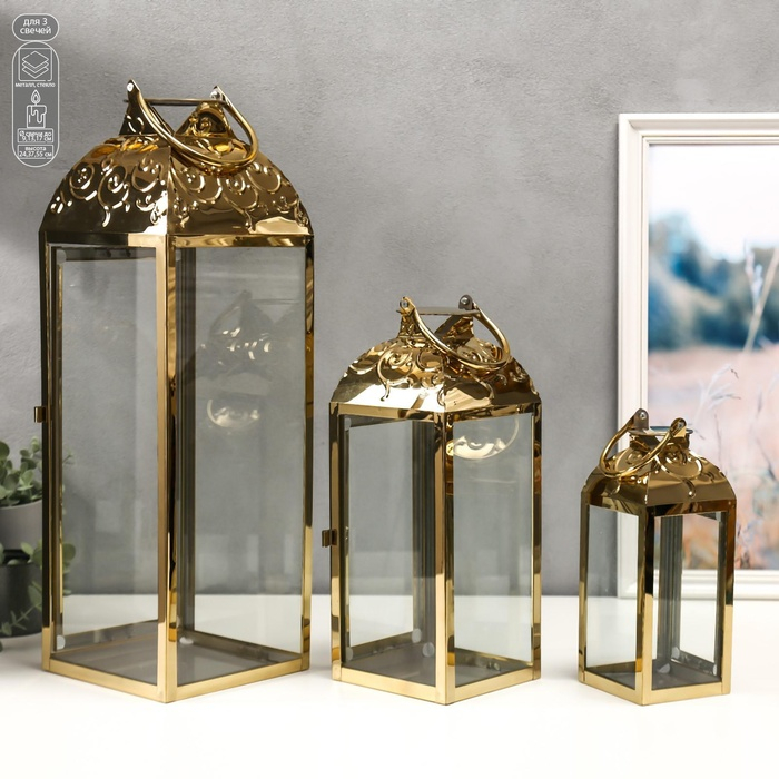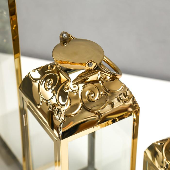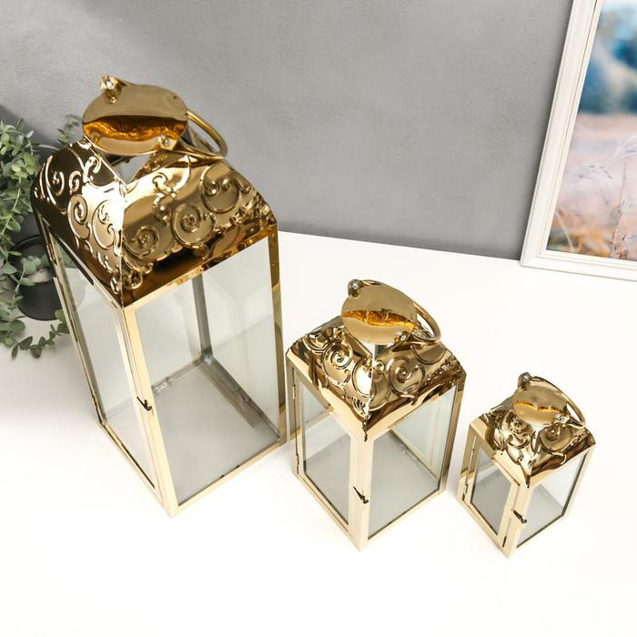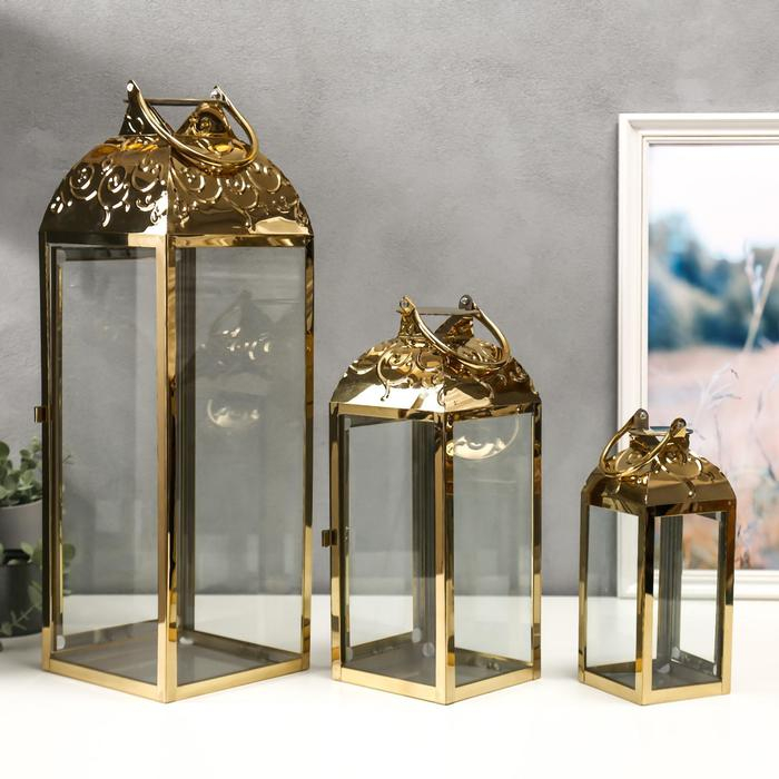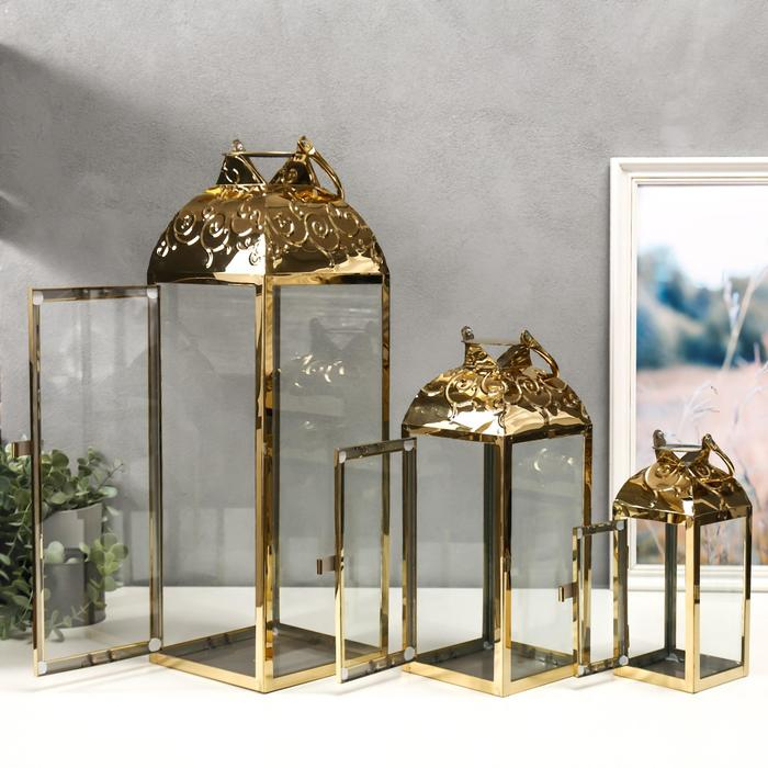 Подсвечник металл, стекло фонарь "Завитки" золото н-р 3 шт 55х18х18 37х14х14 24х10х10 см