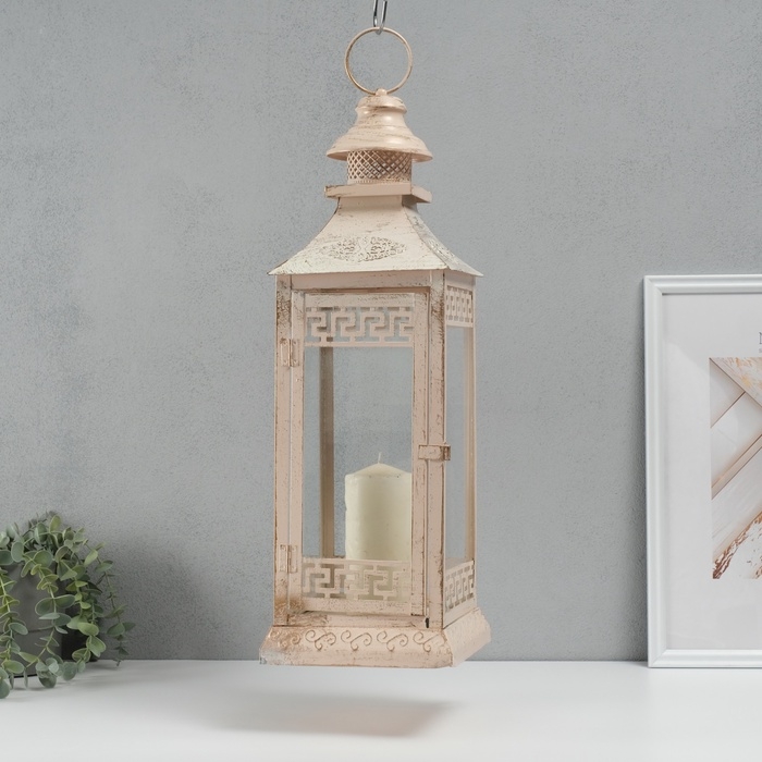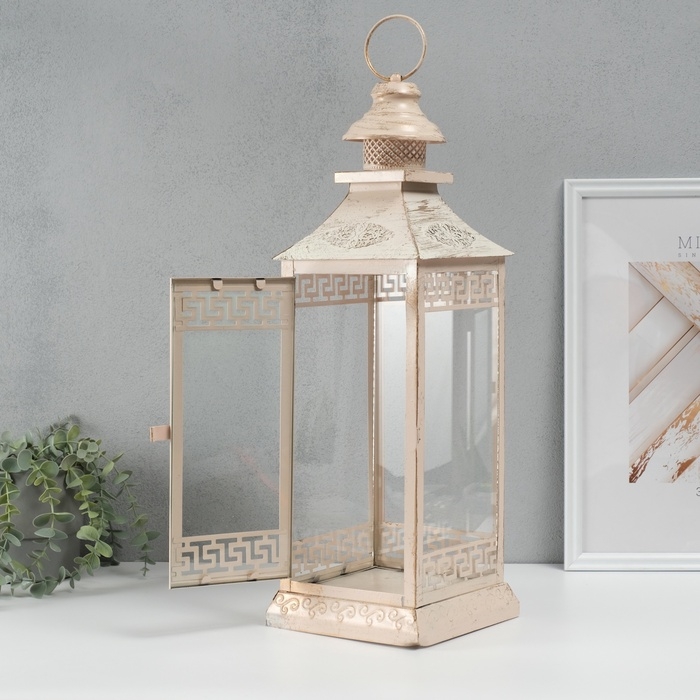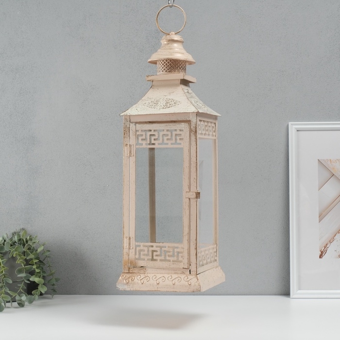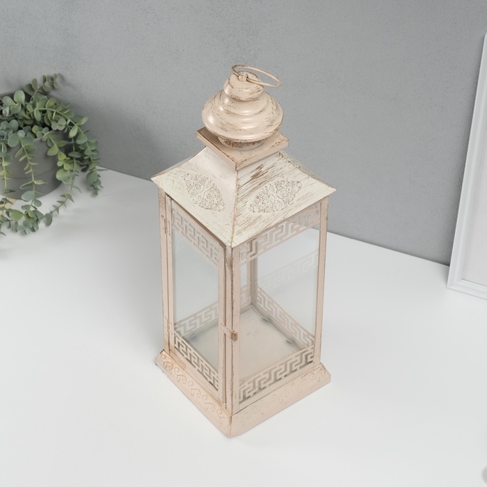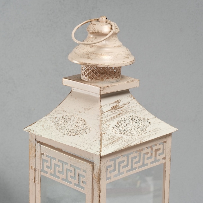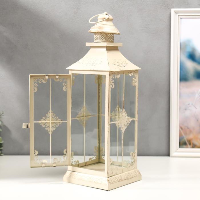 Подсвечник металл, стекло на 1 свечу фонарик "Ажурный ромб" белый с патиной 52,5х17,5х17,5см 54492