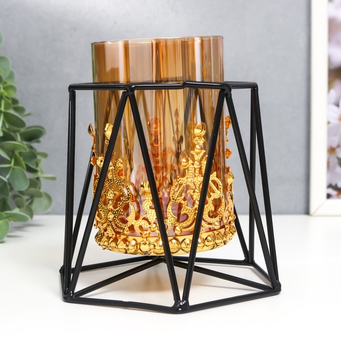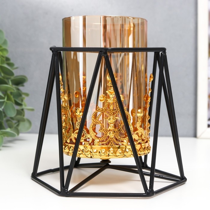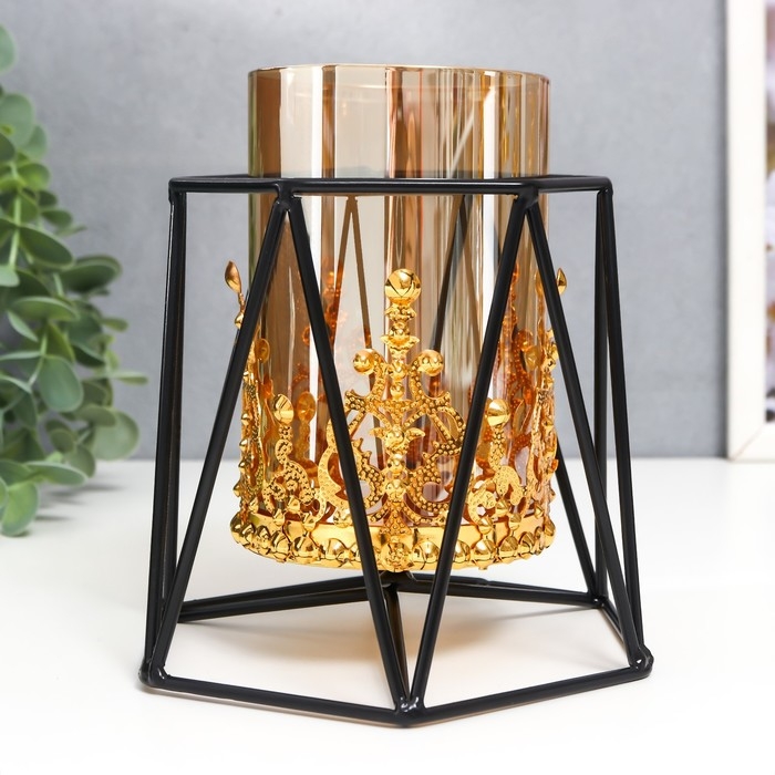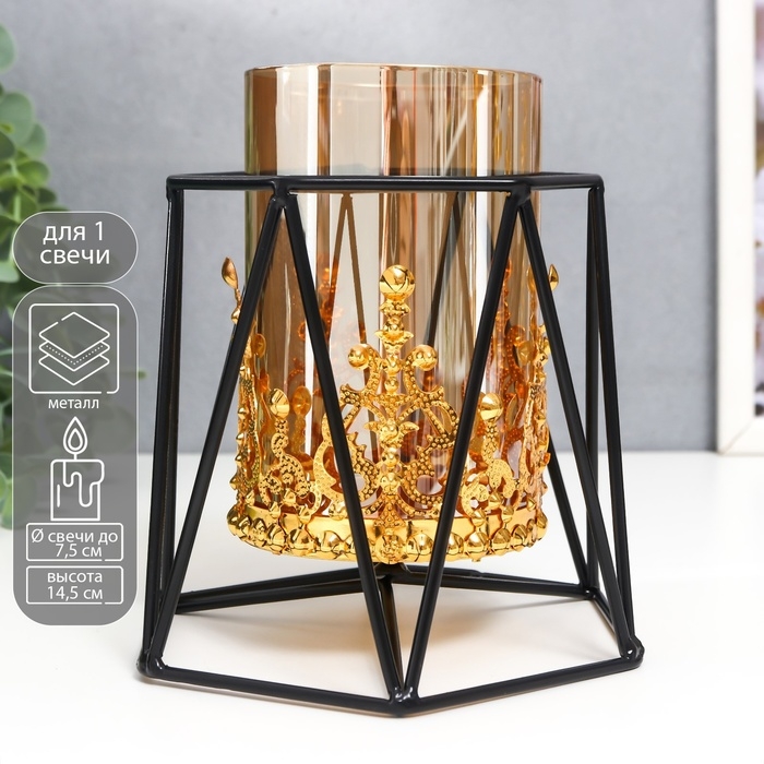 Подсвечник металл, стекло на 1 свечу "Грани" d-7,5 см, золото, чёрный 13х15,5х14,5 см