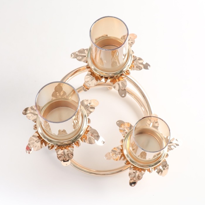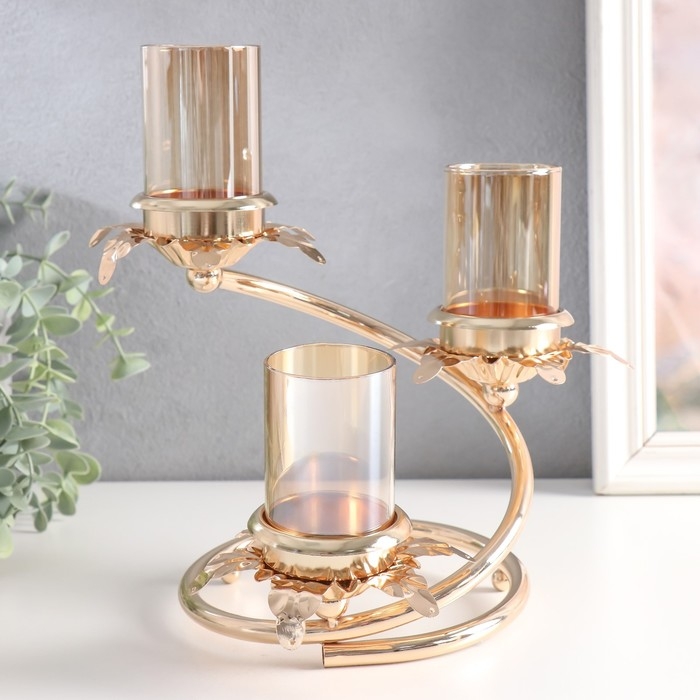 Подсвечник металл, стекло на 3 свечи "Ветвь с листиками" d-5 см золото 15х15х23,5 см