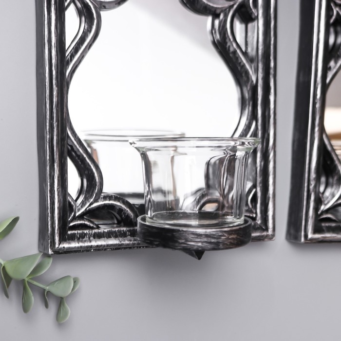 Подсвечник пластик, стекло на 1 свечу "Зеркальные узоры" набор 2 шт d-4 см сереб. 8х13х40 см 90688