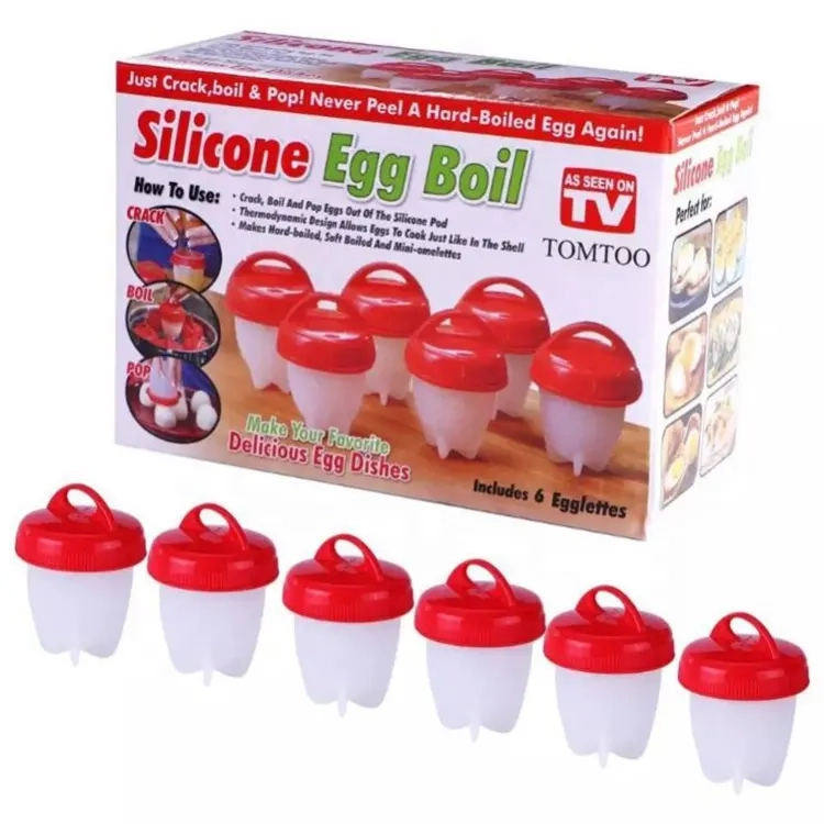 В комплекте 6 силиконовых формочек. Каждая формочка состоит из силиконовой чаши, крышки с маленькой ручкой. В них легко и удобно варить яйца.