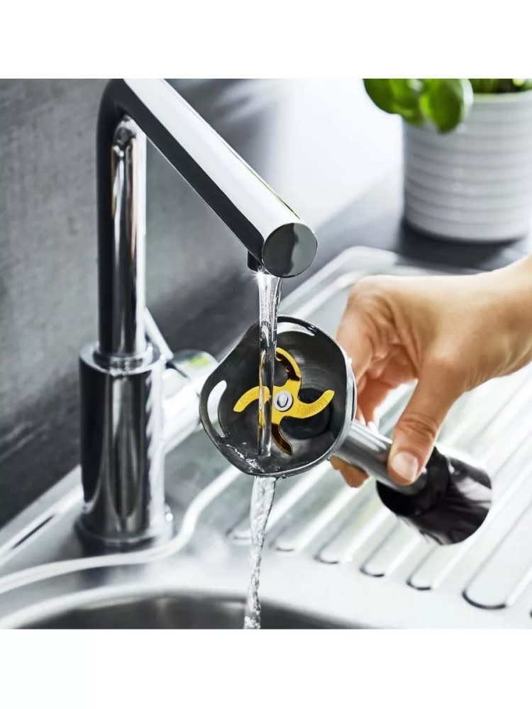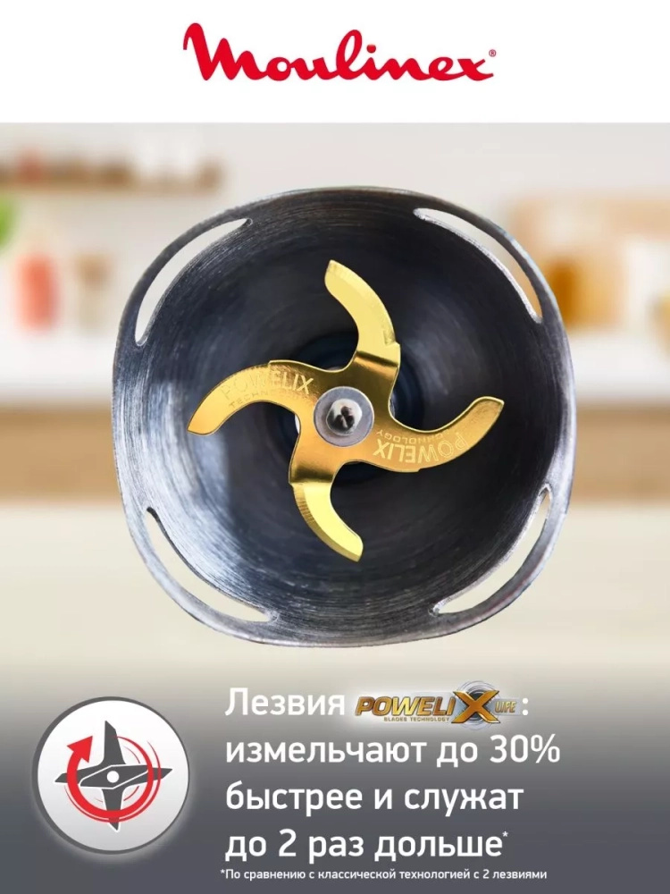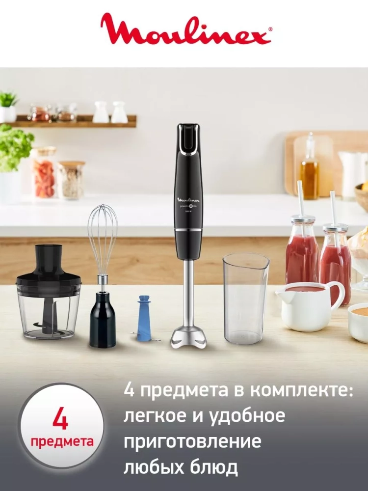 Специальная форма металлической погружной части ручного блендера защищает вас и рабочую поверхность от брызг в процессе работы. Благодаря эргономичнуму дизайну ручки, пользоваться прибором комфортно даже мокрыми руками. Насадки, входящие в комплект, делают кухонный блендер Мулинекс многофункциональным набором.