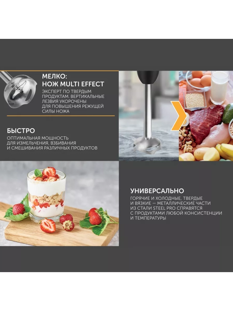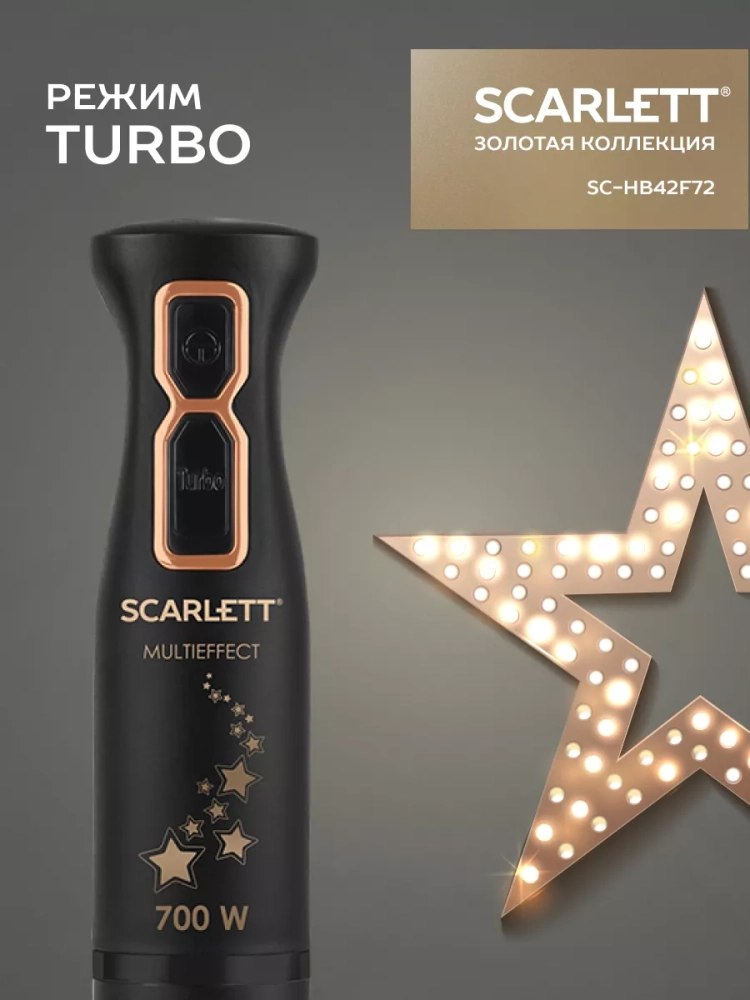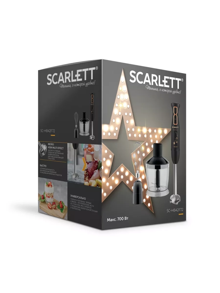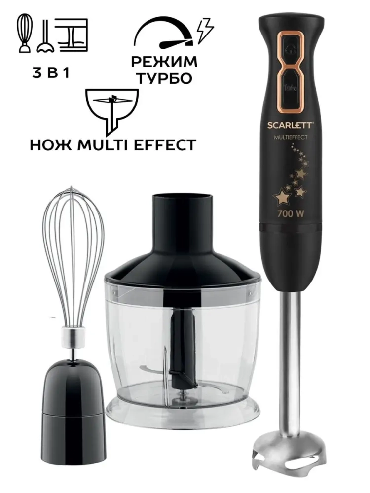 Погружной блендер Scarlett отличается не только своим интересным дизайном, но и мощным мотором. Компактный размер блендера позволяет не загромождать пространство маленькой кухни и всегда оставаться под рукой. TURBO режим поможет всего за каких-то 5 секунд добиться однородности любого из Ваших любимых блюд. Блендер укомплектован тремя съемными насадками (мини-измельчитель, погружная часть, венчик), выполненными из высококачественной нержавеющей стали марки STEEL PRO, благодаря чему можно использовать их для приготовления горячих и холодных продуктов любой консистенции и даже мыть в посудомоечной машине