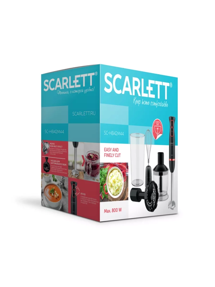 Погружной блендер Scarlett имеет мощный мотор 800 Вт, который обеспечивает быстрое и эффективное измельчение, смешивание, взбивание и даже пюрирование. Благодаря специальной насадке из термостойкого пластика Вы сможете с легкостью приготовить нежнейшее картофельное пюре без комочков. Эту насадку можно также использовать для приготовления детского питания из овощей и фруктов. Ножи и погружная часть блендера выполнены из нержавеющей стали марки Steel Pro, не деформируются и легко моются в посудомоечной машине. Удобная ручка и небольшой вес позволят пользоваться блендером каждый день. Для комфортной работы предусмотрено 2 скоростных режима, а для твёрдых сортов сыров и орехов в модели есть специальная кнопка с TURBO режимом.