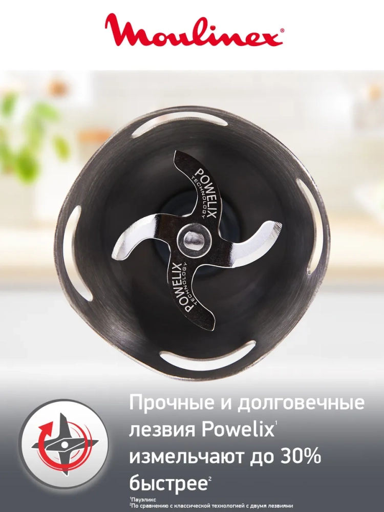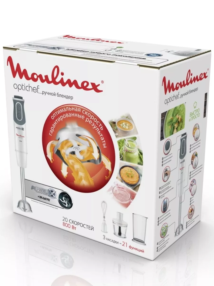 С погружным блендером Moulinex Optichef DD643132 вы легко достигнете идеального результата прикладывая минимум усилий.Оптимальная форма металлической погружной части с лезвиями защищает вас и рабочую поверхность от брызг в процессе смешивания. Электрический ручной блендер оснащен мощным мотором 800 Вт, что обеспечивает оптимальное качество измельчения продуктов. Вы сможете регулировать скорость работы не выключая устройство благодаря интуитивно понятной системе управления. Благодаря эргономичному дизайну ручки, пользоваться прибором комфортно даже мокрыми руками. Насадки, входящие в комплект, делают кухонный блендер Мулинекс многофункциональным набором. Готовить супы и соусы удобно в мерном стакане объемом 800 мл, быстро нарезать зелень можно в чаше измельчителя объемом 500 мл, а для взбивания жидких ингредиентов есть венчик. Насладитесь идеальным процессом и быстрым результатом с погружным ручным блендером Optichef от Moulinex!