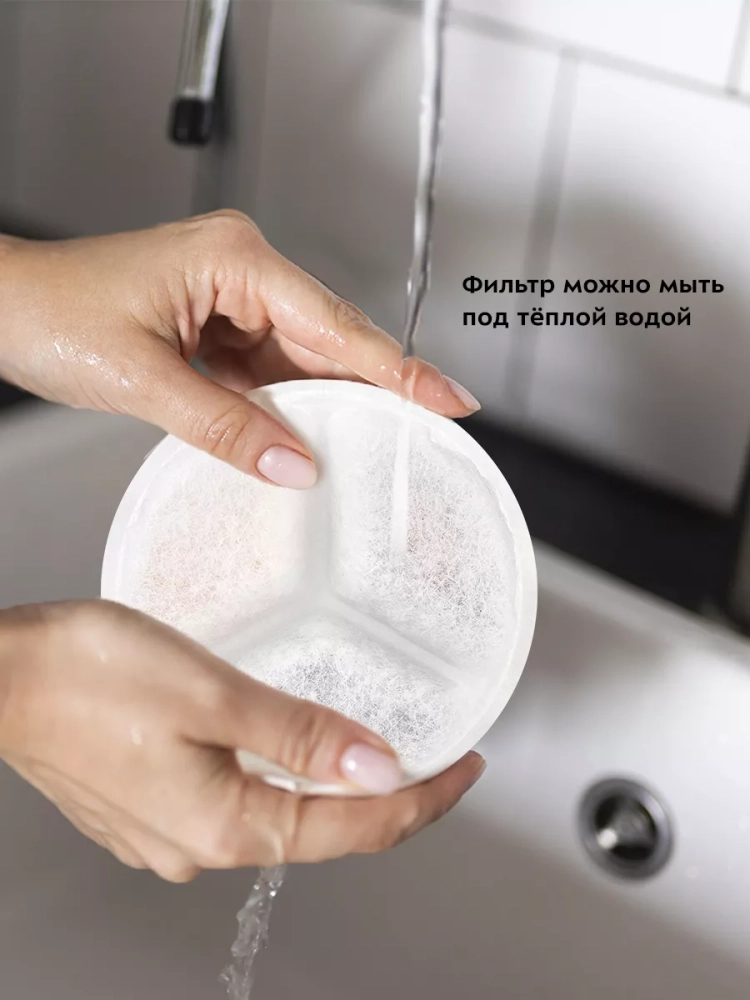 Фонтанчик Китфорт KT-4050 оснащен фильтром для воды. Фильтр задерживает мелкие частицы пыли, шерсть, мусор и очищает воду от тяжелых металлов и запахов. Устройство работает с минимальным шумом, так что не напугает вашего питомца. Внутри резервуара для воды расположена шкала уровня воды. Если уровень воды в резервуаре опустится ниже минимальной отметки, устройство автоматически выключится. На чашу для питья крепится крышка, которая предотвращает распространение брызг при использовании фонтанчика.