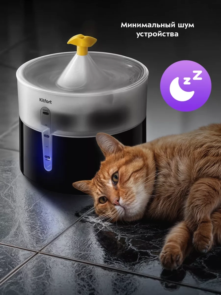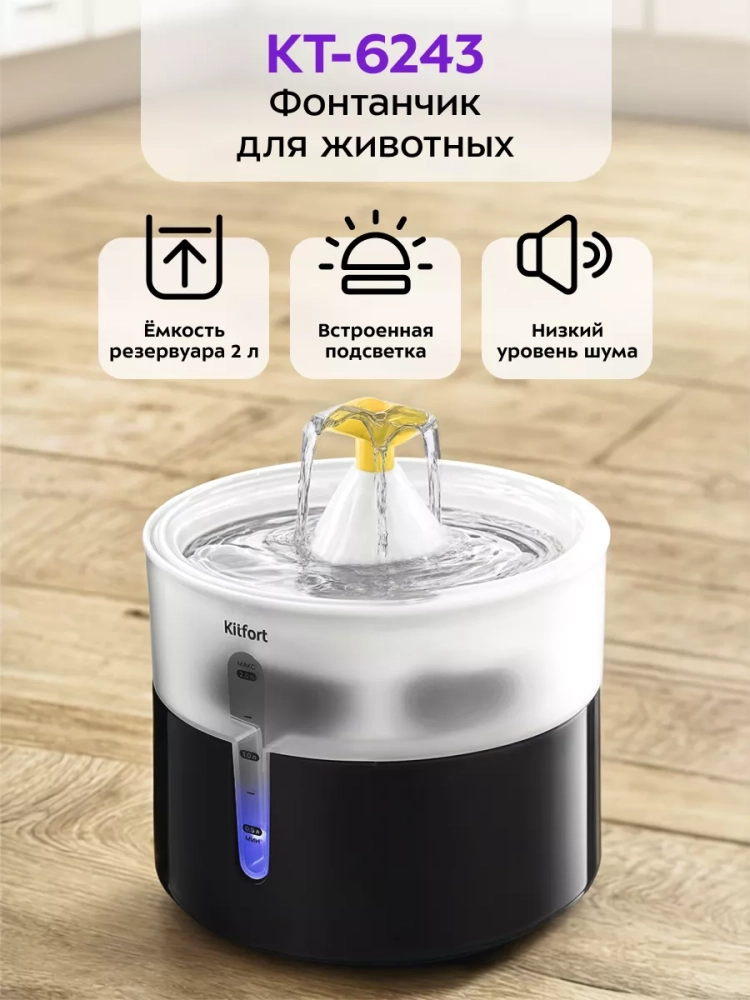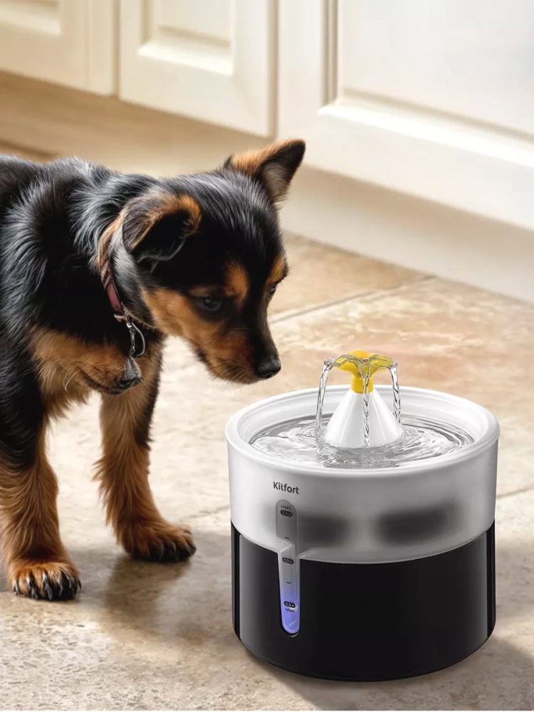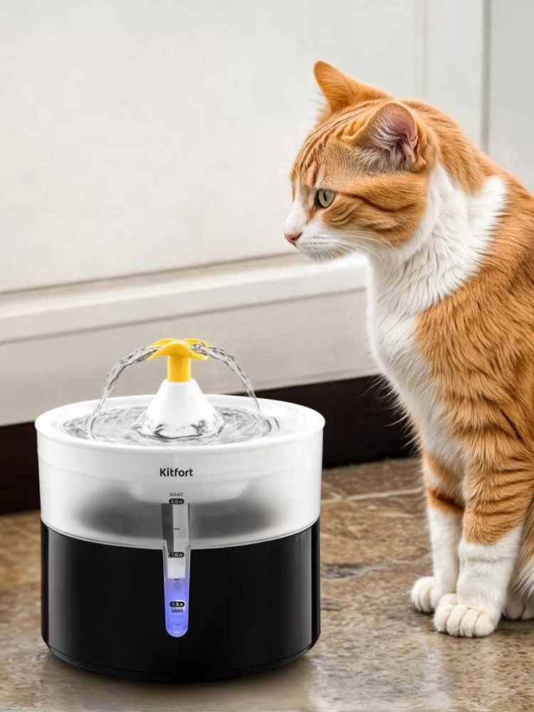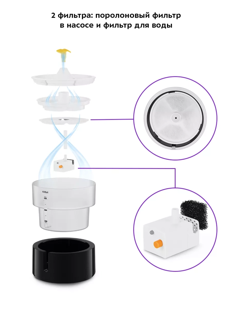 Фонтанчик для животных Kitfort KT-6243 — это устройство, обеспечивающее ваших питомцев чистой незастоявшейся водой. Водяной насос перекачивает воду из внутреннего резервуара в чашу для питья, откуда вода стекает обратно в резервуар через прорези в чаше. При этом вода проходит через два фильтра, которые смягчают ее и очищают от постороннего привкуса, запаха и загрязнений. Когда вода выходит из фонтанчика и подается в чашу, происходит обогащение воды кислородом, что предотвращает застаивание воды.