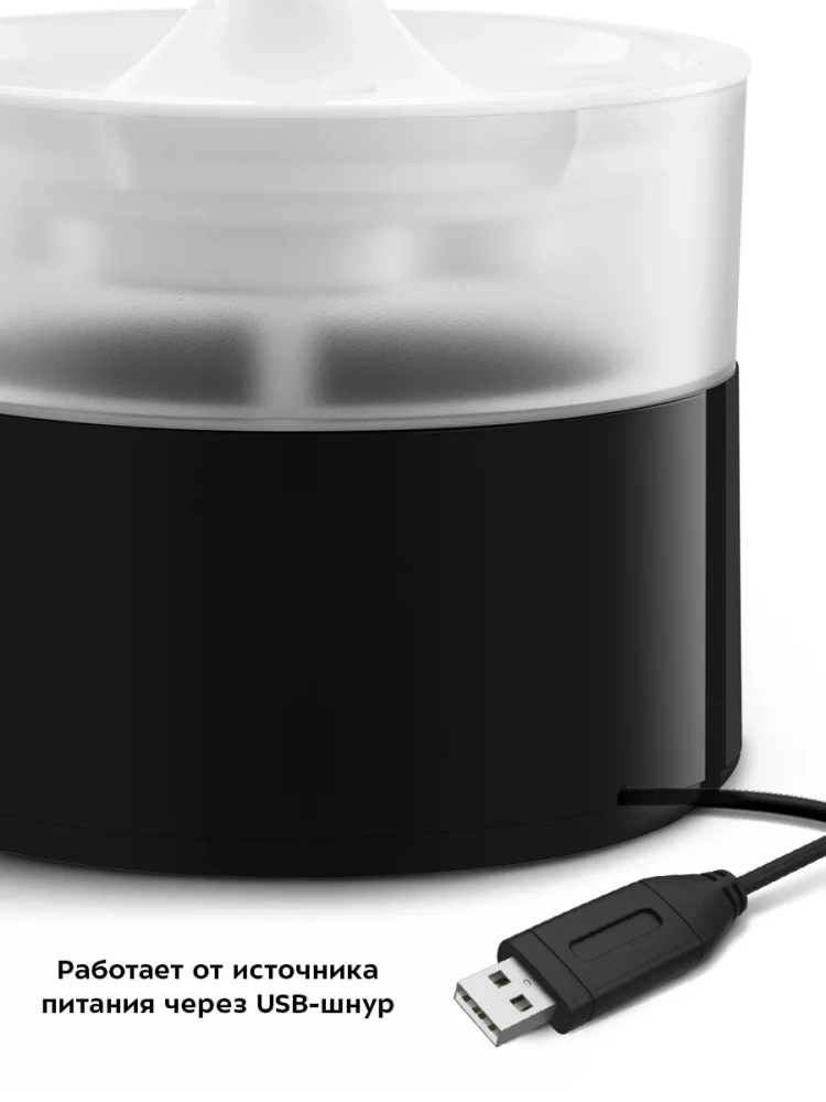 Фонтанчик для животных подключается к источнику питания с помощью USB-шнура. Наличие USB-шнура позволяет подключать устройство к сети питания через блок питания (входит в комплект) или к стороннему источнику питания (пауэрбанку, ноутбуку или компьютеру).