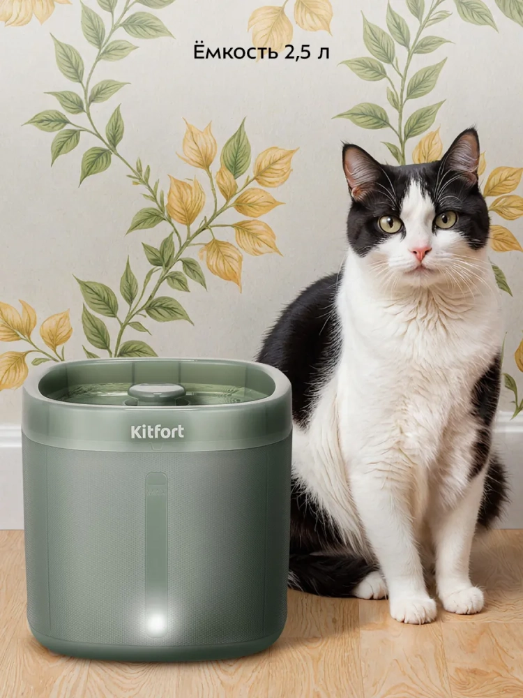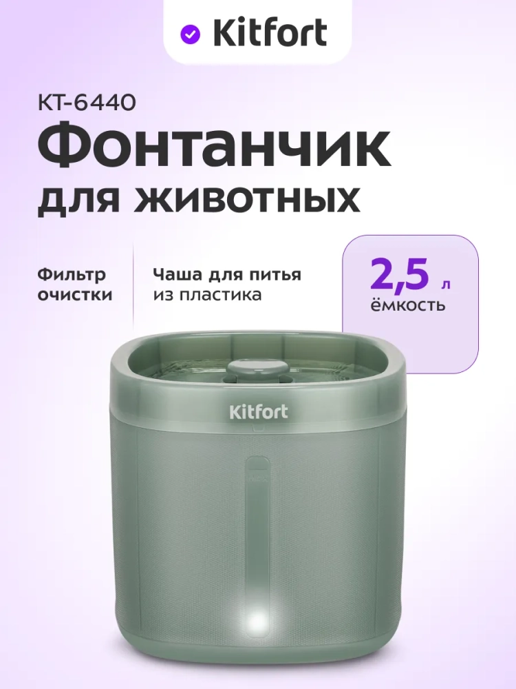 Фонтанчик для животных Kitfort KT-6440 — это устройство, обеспечивающее ваших питомцев чистой незастоявшейся водой. Водяной насос фонтанчика перекачивает воду из резервуара для воды в чашу для питья, откуда вода стекает обратно в резервуар через отверстие в чаше. При этом вода проходит через фильтр, который очищает ее от вредных примесей, неприятного запаха и привкуса. В процессе циркуляции вода обогащается кислородом, что предотвращает застаивание воды в фонтанчике.