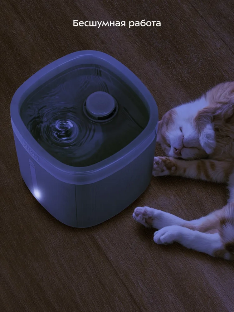 Устройство подключается к источнику питания с помощью USB-шнура насоса. Наличие USB-шнура позволяет подключать фонтанчик к сети питания через блок питания (входит в комплект) или к стороннему источнику питания (пауэрбанку, ноутбуку или компьютеру).