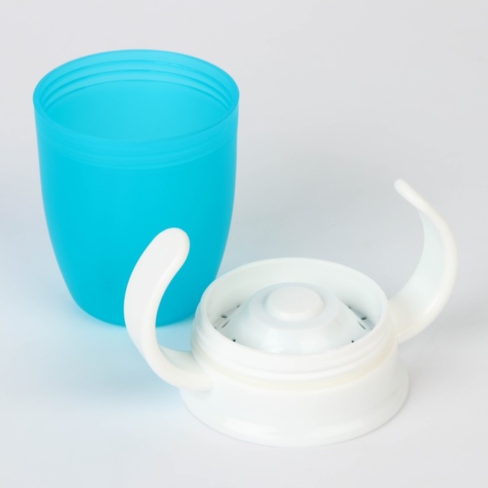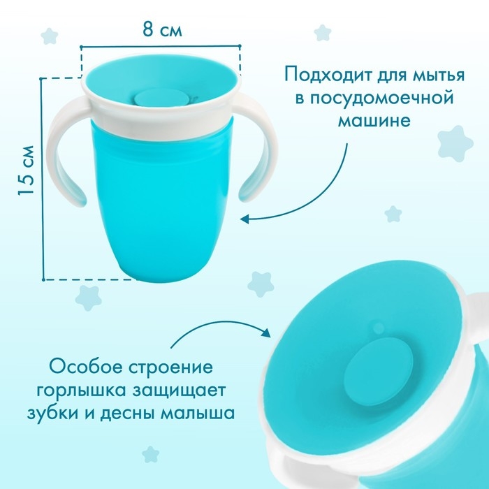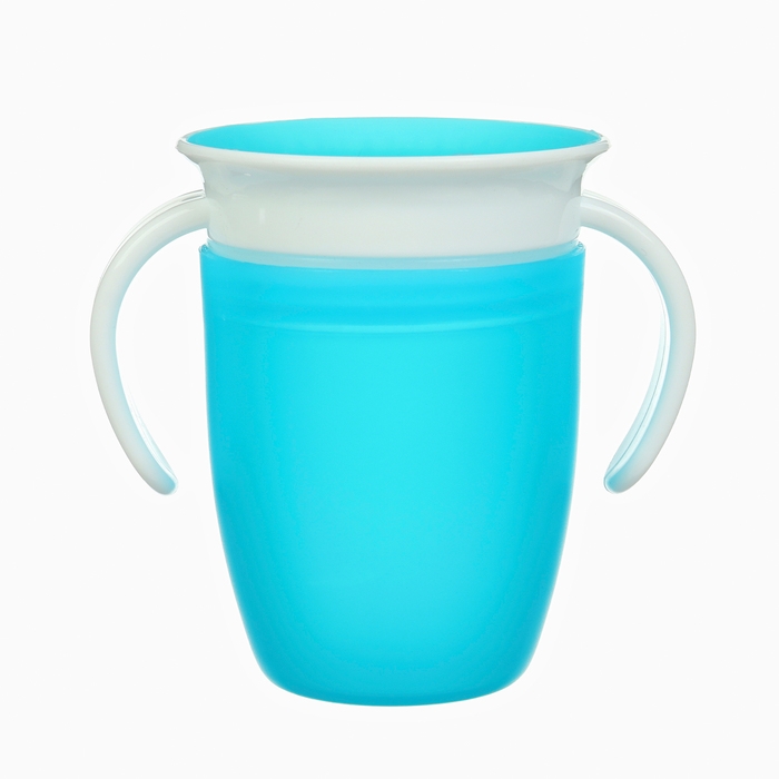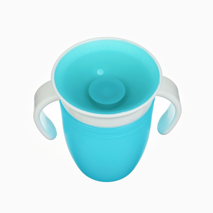 Этот обучающий поильник позволяет малышу пить напиток по всей окружности поильника 360 градусов. Напиток равномерно распределится под крышкой, под каким бы углом ребёнок не наклонил емкость. Так же конструкция оснащена защитой от проливания, поэтому жидкость не выльется даже если перевернуть поильник.