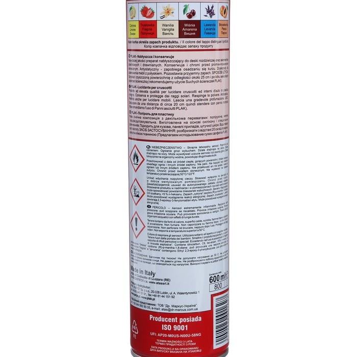 Особенностью полироля Plak Клубника является его приятный аромат, который оставляет после себя свежесть в салоне автомобиля. Этот аромат долгое время сохраняется в интерьере, создавая ощущение чистоты и уюта. Использование данного средства просто: достаточно встряхнуть баллон, распылить аэрозоль на поверхность с расстояния 20-25 сантиметров и отполировать мягкой тряпочкой. Для достижения наилучшего результата рекомендуется предварительно очистить поверхность от загрязнений.
