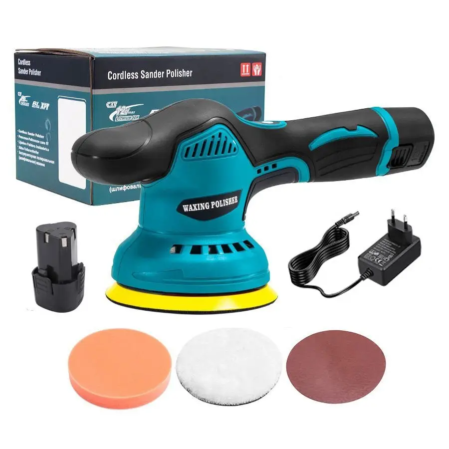 Полировочная машинка на аккумулятореПолировочная машинка на аккумуляторе 12В, 8 режимов, с эллиптическим вращением, индикатор батареи на ручке, 380Вт, 2800-5500об/мин . Легкая, компактная конструкция, легко носить с собой и хранить. Машинка достаточно мощная для выполнения профессиональных задач, при этом проста в управлении, поэтому с ней справятся даже новички.Характеристики- Максимальная мощность: 380 Вт- Диаметр диска: 125-150 мм- Обороты: 2800-5500 об/мин- Время работы аккумулятора на полной мощности до 25 минут- Ход эксцентрика 9 мм, что обеспечивает качественную обработку без полос и перегрева поверхности. Машинка имеет 8 скоростей от 2800-5500 об/мин. Вы сможете подобрать скорость для различных задач и материалов, так, чтобы не повредить обрабатываемую поверхность и выполнить работу максимально быстрее.