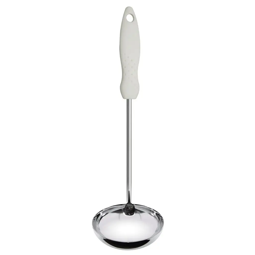 Подача супов, компотов, соусов, жидких блюд и напитков невозможна без половника — простого приспособления, которое должно быть на каждой кухне. Кухонный инструмент состоит из чаши и ручки, изготовлен из хромированной стали и пластмассы. На ручке есть отверстие, за которое половник можно повесить на крючок. После использования промойте в проточной воде с моющими средствами.