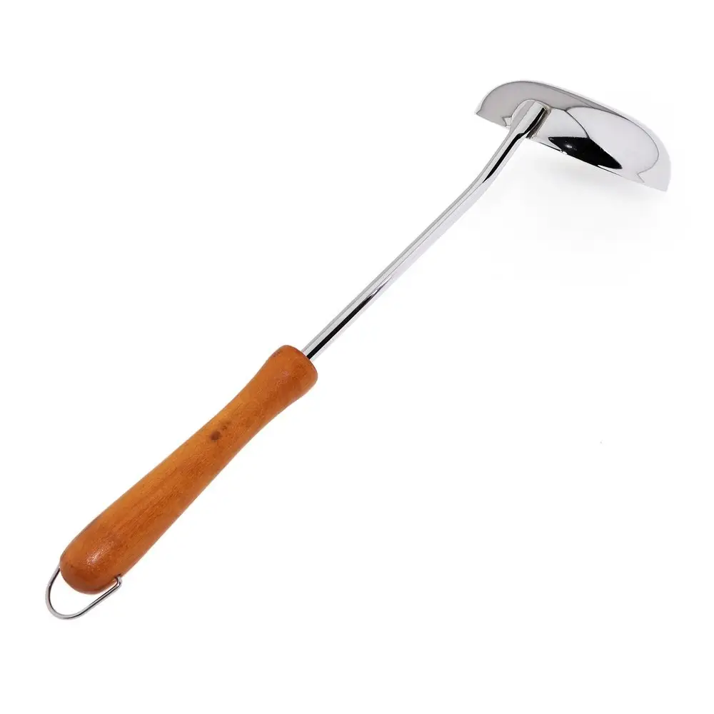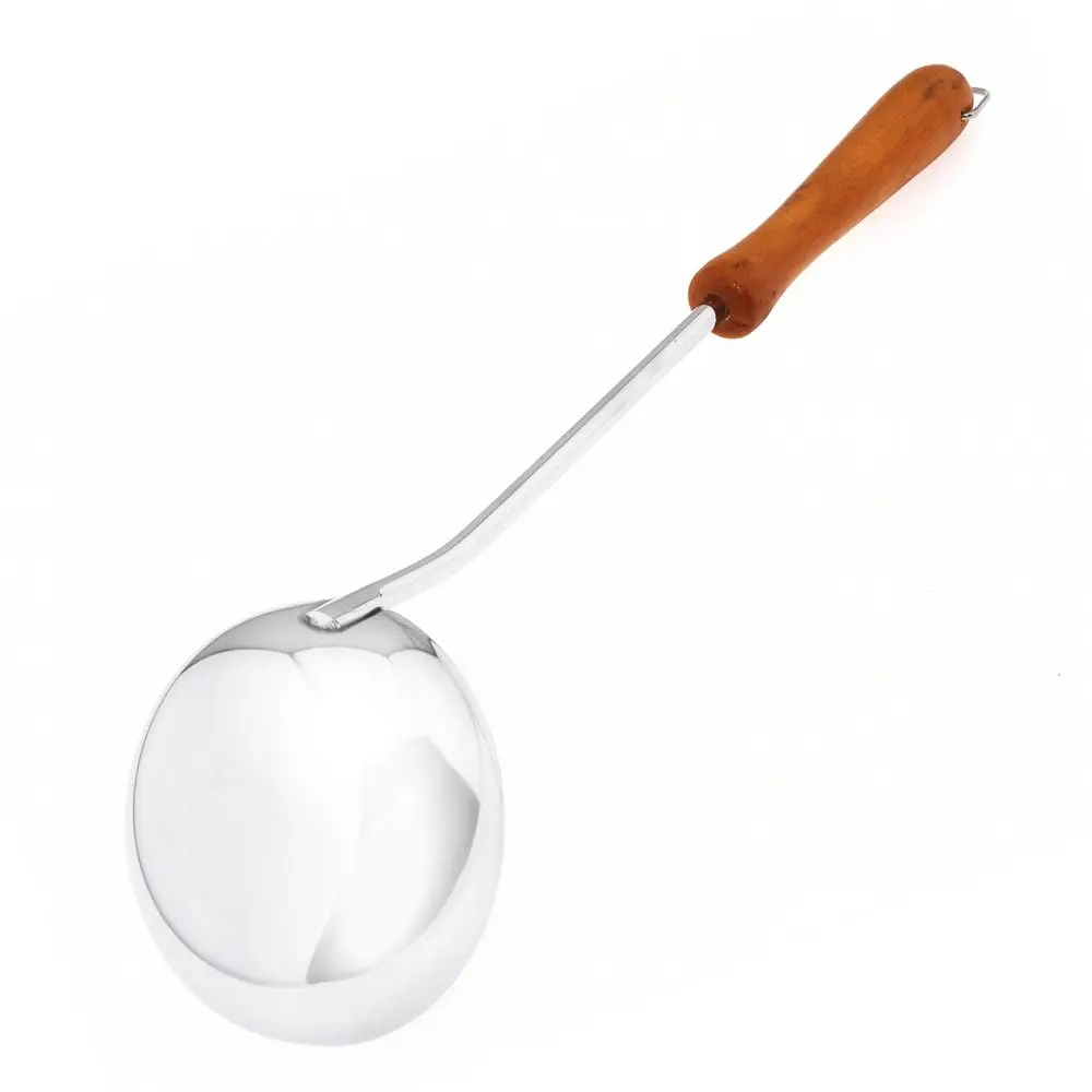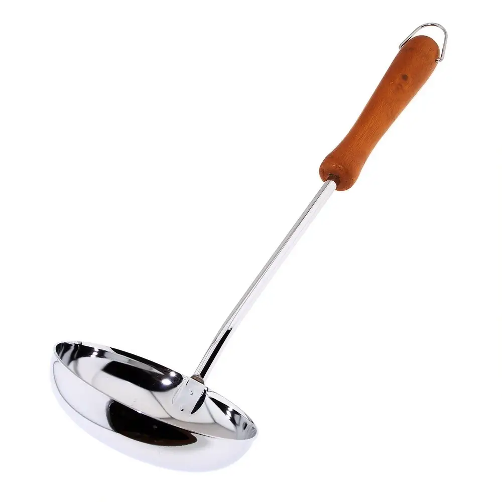 На кухне не обойтись без обычного половника. С этим приспособлением легко раскладывать первые блюда, разливать компоты, морсы, кисели. Деревянная ручка не нагревается, препятствует возникновению ожогов. На ручке есть металлическая петля для того, чтобы повесить половник на крючок. Изделие изготовлено из стали с хромированным покрытием — блестящего, долговечного материала.