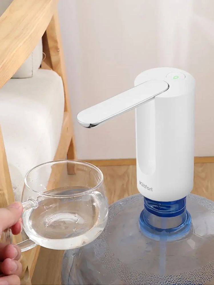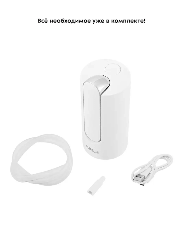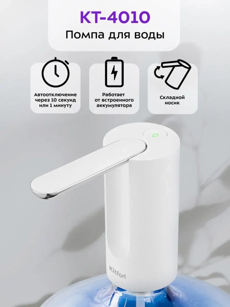 Электрическая помпа для воды Kitfort КТ-4010 предназначена для удобного перелива воды из бутыли в любую другую емкость. Помпа полностью автономная и предназначена для установки на стандартные 19-литровые бутыли. Однако прибор может быть установлен на бутыли с диаметром горлышка 20–60 мм, например, стандартные бутыли емкостью 5, 10 и 17 л. Но в этом случае помпа не будет плотно прилегать к горлышку емкости.