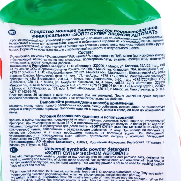 Порошок стиральный Sorti Супер Экон Автомат, 6 кг