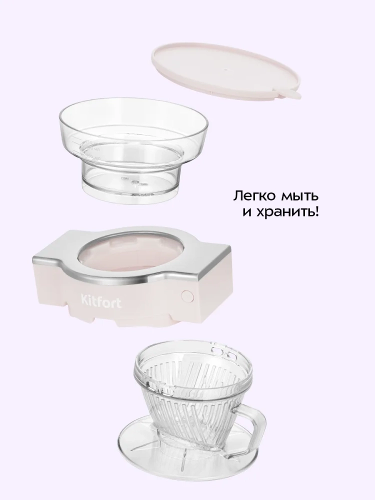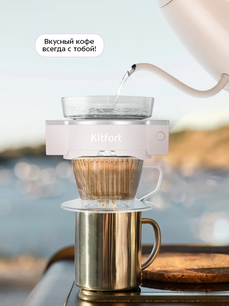 Портативная кофеварка-пуровер Kitfort КТ-7571 готовит ароматный черный кофе из молотого кофе. Особенность данной кофеварки заключается в воронке для пуровера. Пуровер (англ. pour over — лить сверху) — это метод заваривания кофе, при котором горячая вода проходит через молотый кофе, который находится в специальной воронке; горячая вода проливается вручную, однако данная кофеварка проливает воду сама.
