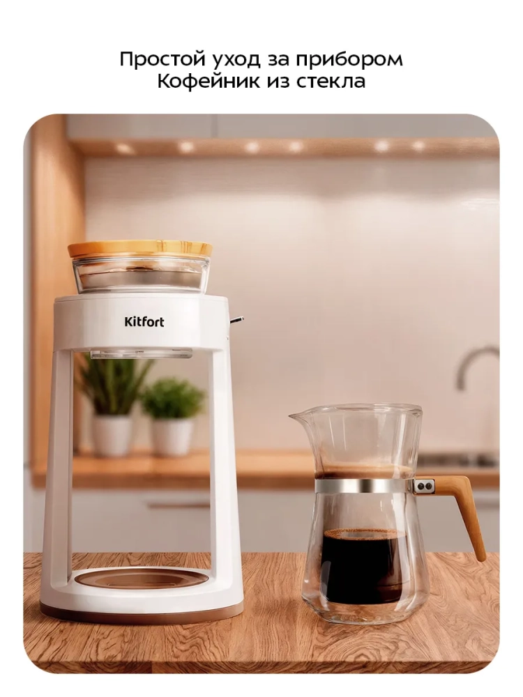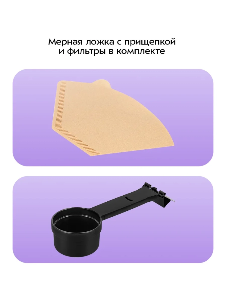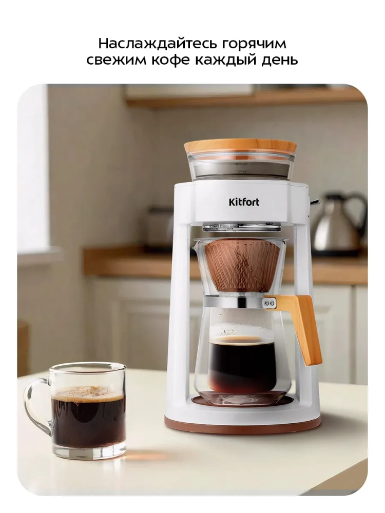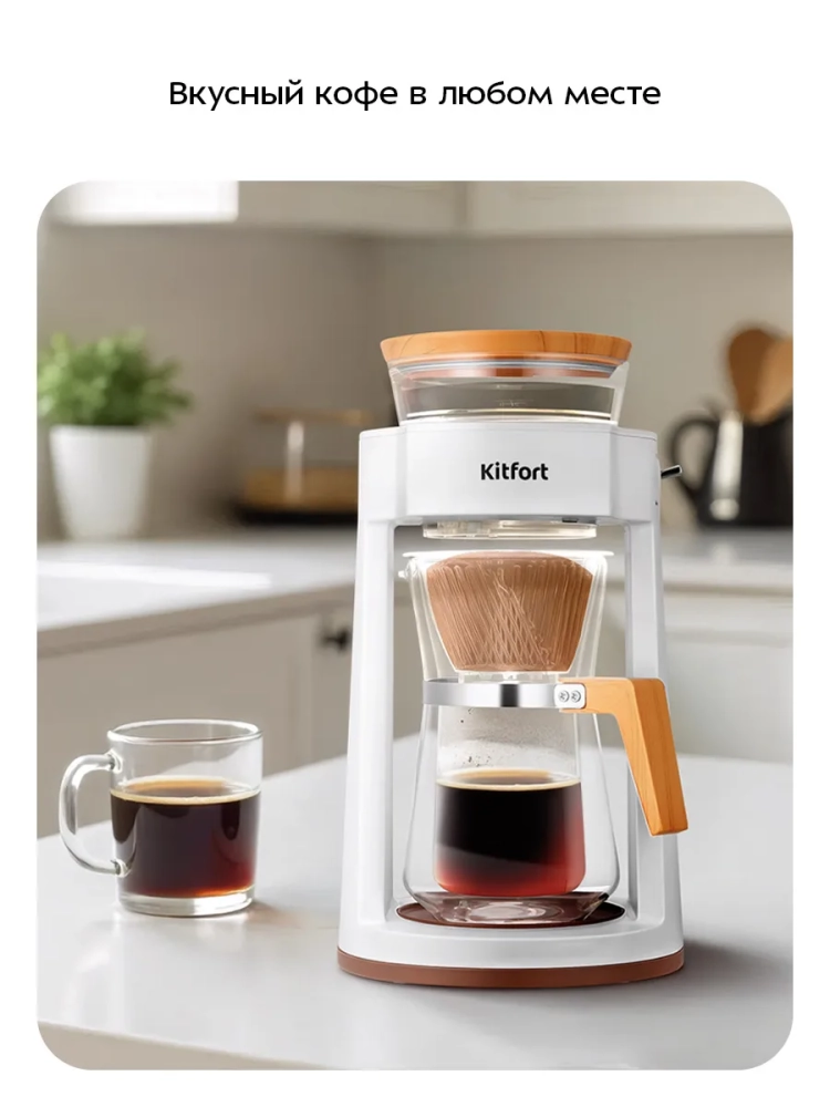 Портативная кофеварка-пуровер Kitfort КТ-7573 готовит ароматный черный кофе из молотого кофе. Особенность данной кофеварки заключается в воронке для пуровера. Пуровер (англ. pour over — лить сверху) — это метод заваривания кофе, при котором горячая вода проходит через молотый кофе, который находится в специальной воронке; горячая вода проливается вручную, однако данная кофеварка проливает воду сама.