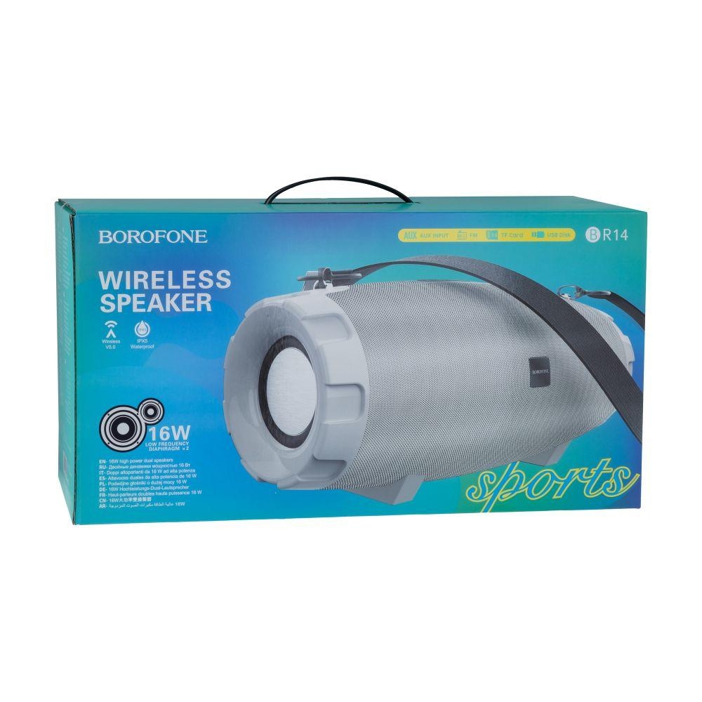 Портативная колонка Borofone BR14 Coolant sports grey – Мощность: 10 Вт – Время работы: до 12 часов – Поддержка Bluetooth 5.0 – Водозащита: IPX5 – Диапазон частот: 100 Гц – 18 кГц – Вес: 500 г – Цвет: спортивный серый.