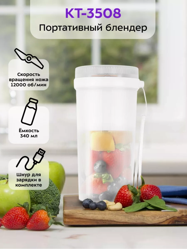 КТ-3508 работает от аккумулятора и заряжается с помощью кабеля micro USB. Он незаменимый помощник для приготовления смузи, милкшейков, домашнего детского питания, протеиновых и детокс-коктейлей, супов-пюре и множества других блюд. Перед смешиванием все ингредиенты необходимо порезать на кусочки. Для более эффективной работы блендера рекомендуется смешивать твердые ингредиенты с небольшим количеством жидкости.