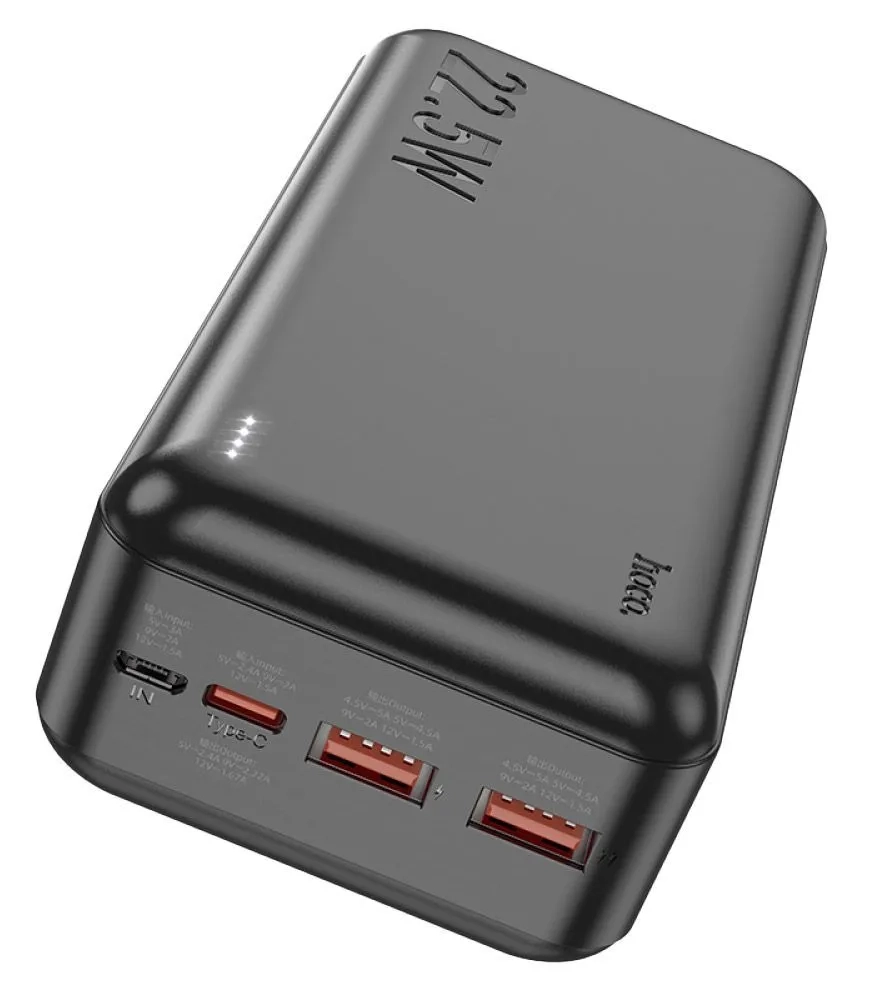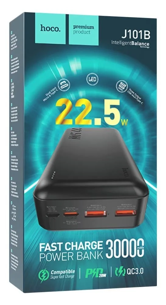 Hoco J101B Astute 22.5W fully compatible power bank (30000mAh) - внешний аккумулятор для айфона, Android-смартфонов и других современных USB-гаджетов. Три выходных разъёма: USB-A1, USB-A2, Type-Cout поддерживают быструю зарядку, включая Quick Charge 3.0 (QC3.0) и Power Delivery (PD) для iPhone.