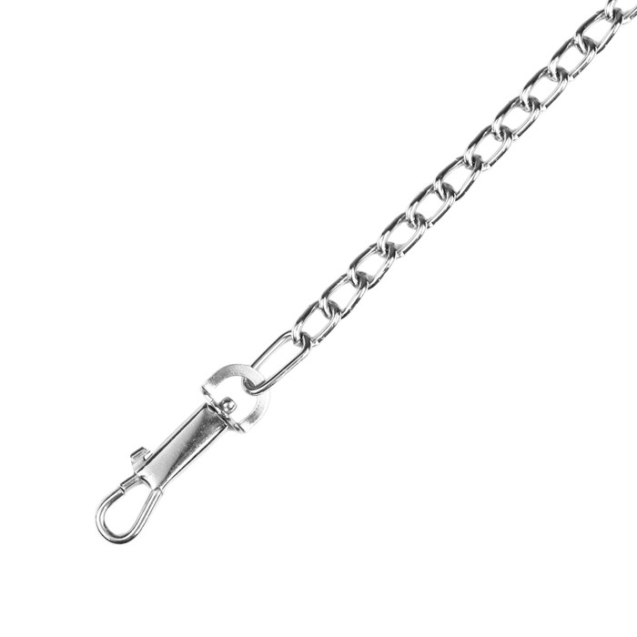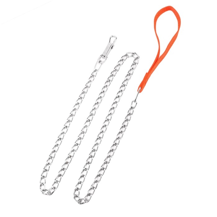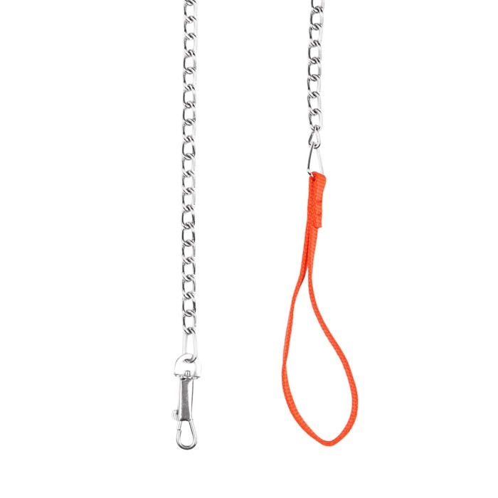 Поводок состоит из хромированной цепочки и мягкой нейлоновой ручки. Ручка прошита армированной нитью, удобно располагается в ладони и не натирает при натяжении.