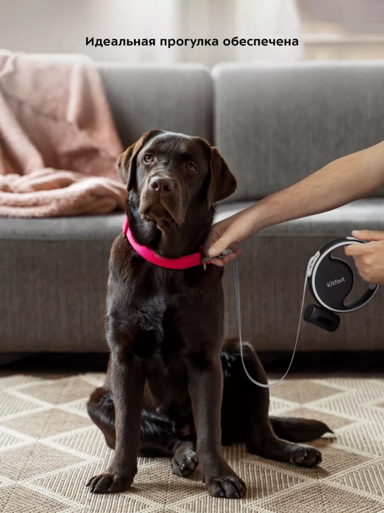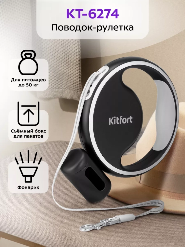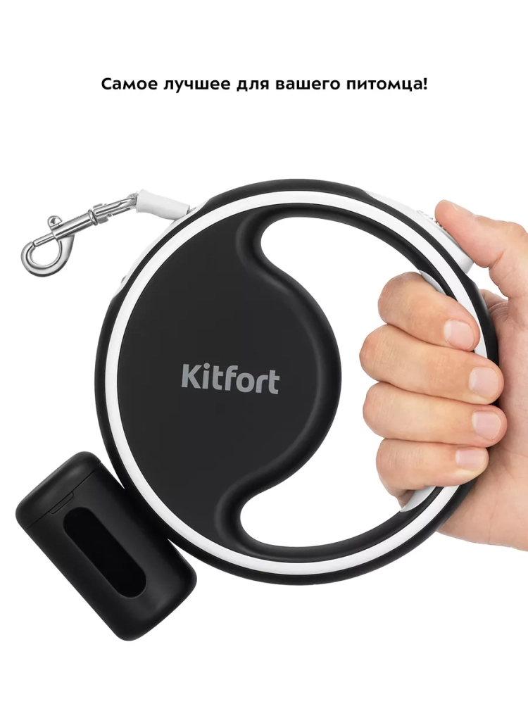 Поводок-рулетка Kitfort КТ-6274 имеет необычную форму, что делает его не только удобным, но и ярким аксессуаром. Фиксатор ленты расположен над ручкой, чтобы мгновенно активировать тормоз и удержать питомца от рывка или увести его сторону. Лента шириной 1 см со светоотражающим элементом обладает высокой прочностью и выдерживает нагрузку до 50 кг. Благодаря автоматическому затягиванию в корпус лента не спутывается при хранении. Также поводок-рулетка оборудован съемным держателем пакетов для выгула, чтобы их было удобно использовать.