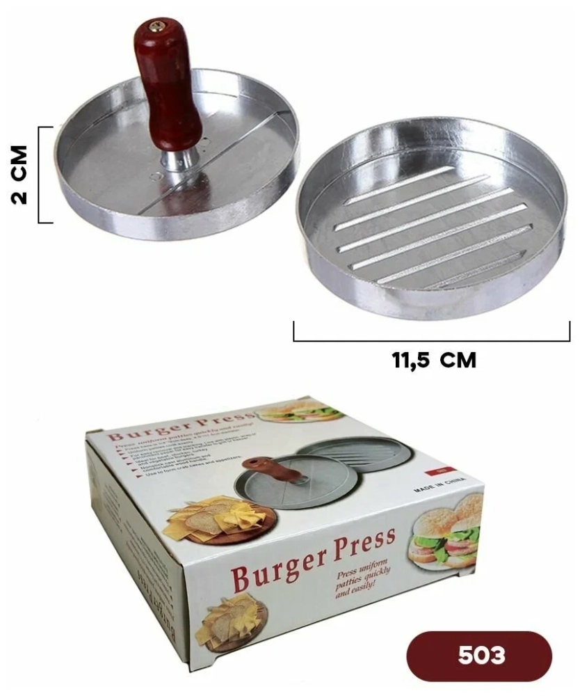 Пресс для бургеров - кухонное приспособление, с помощью которого каждая хозяйка сможет приготовить настоящий бургер в домашних условиях . Приготовить котлету для гамбургера легко с новым прессом из литого алюминия с цинковым покрытием. Удобная модель, которая подойдет для приготовления домашнего гамбургера или при создании незабываемого бургера на гриле. Пресс полностью безопасен для человека, никаких вредных веществ не выделяется. Для отделения ненужного мяса не придется прикладывать особых усилий, все произойдет автоматически, следует только слегка нажать на рукоятку. Поместите фарш в металлическую форму и придавите прессом. Аккуратный бургер готов, осталось только обжарить с обеих сторон. Рельефная поверхность формы и пресса делают в котлете бороздки для эффекта гриль, а так же благоприятствует равномерному прожариванию фарша. Просто, быстро, вкусно! Профессиональный пресс для бургеров - это идеальное инструмент для гриля и готовки, который поможет вам легко готовить вкусные гамбургеры и котлеты идеальной формы. Пресс-форма подходит для формования котлет и гамбургеров из фарша идеально подходящую к гамбургеру любого мяса, рыбы и птицы, также форма подходит для приготовления котлет с начинкой. По мимо мясных блюд кухонный аксессуар подойдет для приготовления сырников, а также поможет придать форму рису и овощам спрессовав их. После использования бургер-пресс, можно легко мыть в посудомоечной машине, это идеальный подарок для любителей гамбургеров, бургеров, домашних котлет и мастеров домашней кухни. Котлетница сэкономит массу времени и сил, а вы получите быстрые ровные котлеты.