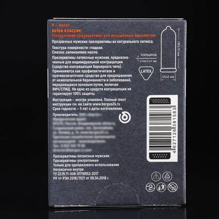 Презервативы BAYAN «Классик» обильно покрыты гипоаллергенной смазкой на силиконовой основе, что обеспечивает дополнительный комфорт и безопасность. ВAYAN — Русский дух с немецким качеством.